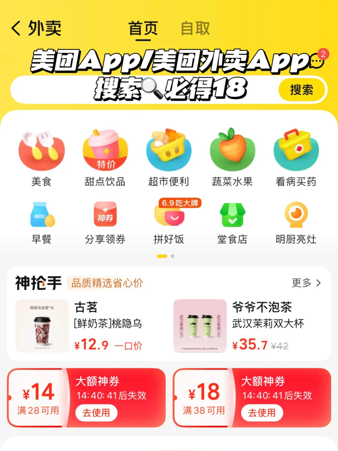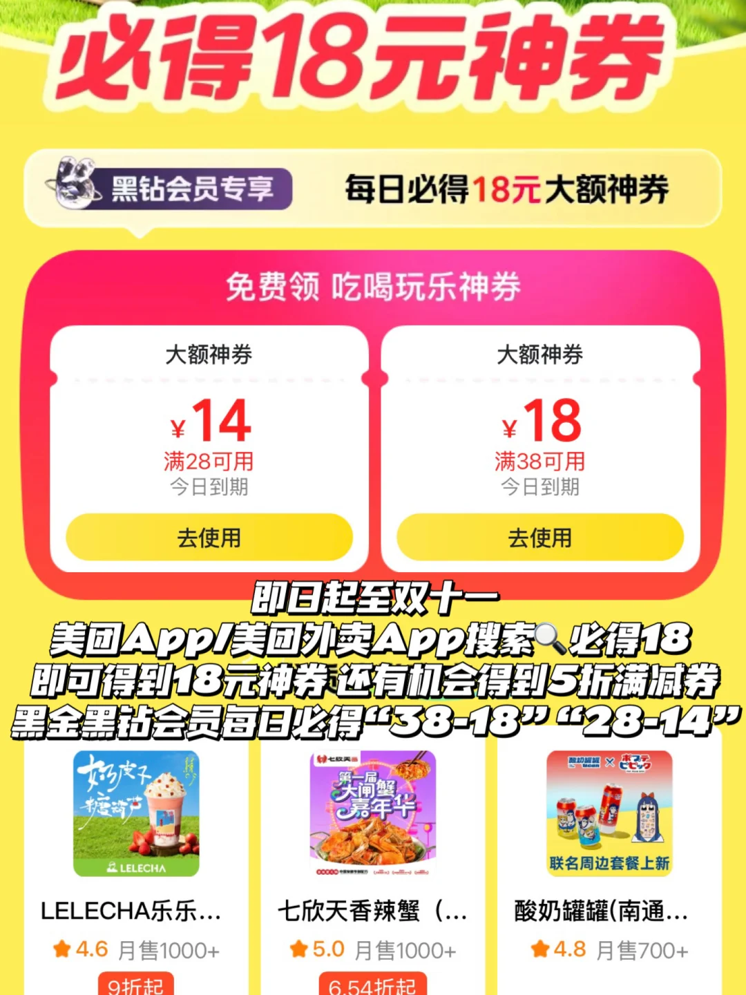 📝活动内容:美团App/美团外卖App搜索🔍[必得18] 即可得到18元神券 还有机会得到5折满减券