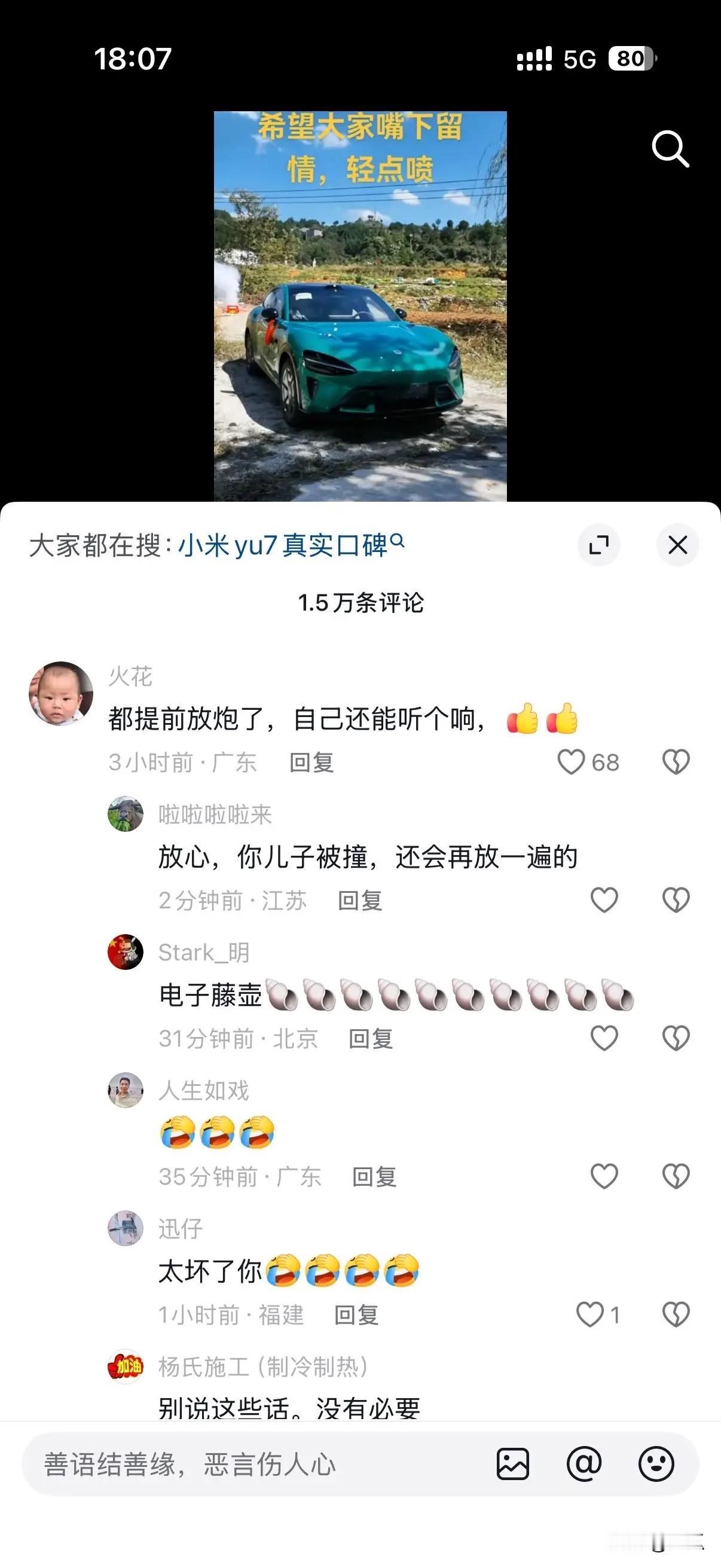 发个YU7提车,被攻击了1.5万条评论 这个群体真的越来越没下限了,网上骂已经不满足,部分极端的开始线下划车,再这样搞下去早晚出大事