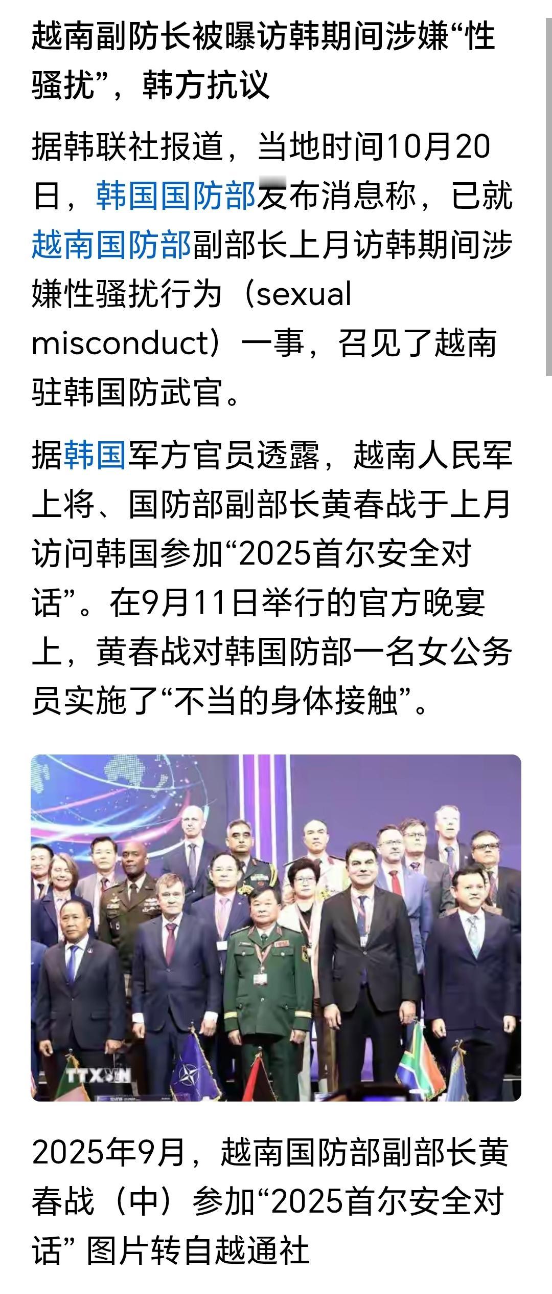 这条新闻劲爆。越猴丢大脸了。越南国防部副部长访问韩国期间性侵韩国女公务员。然后被韩国国防部抗议,现在又被韩国媒体口诛笔伐。 韩国国防部抗议是黄春战性骚扰,但是到了韩联社那里就变成了性侵。到底是哪一种情况?这两种情况差别有点大,到底是韩联社工作人员的中文水平不行还是确实是这么严重的行为? 也没有更多的信息可以佐证了。所以只能这样认为了,可能这位大兄弟看见硅胶娃娃忍不住伸了咸猪手,毕竟越猴军方在他们国内是嚣张惯了,觉得这么一个小动作无伤大雅,结果没想到会闹这么大。 或者他是这样想的:美国大兵都摸得他凭什么摸不得?美国大兵还是他们手下败将呢。 谁想韩国人不按他的思路走,美军是爹,越猴只是猴,这待遇能一样吗? 不过还有另外一种可能,就是想色诱拉拢,结果没有成功于是反咬一口也不是没有可能。 没事看看村头狗打架也还是挺有意思的。 点右上角关注我,我们一起去看这个魔幻的世界