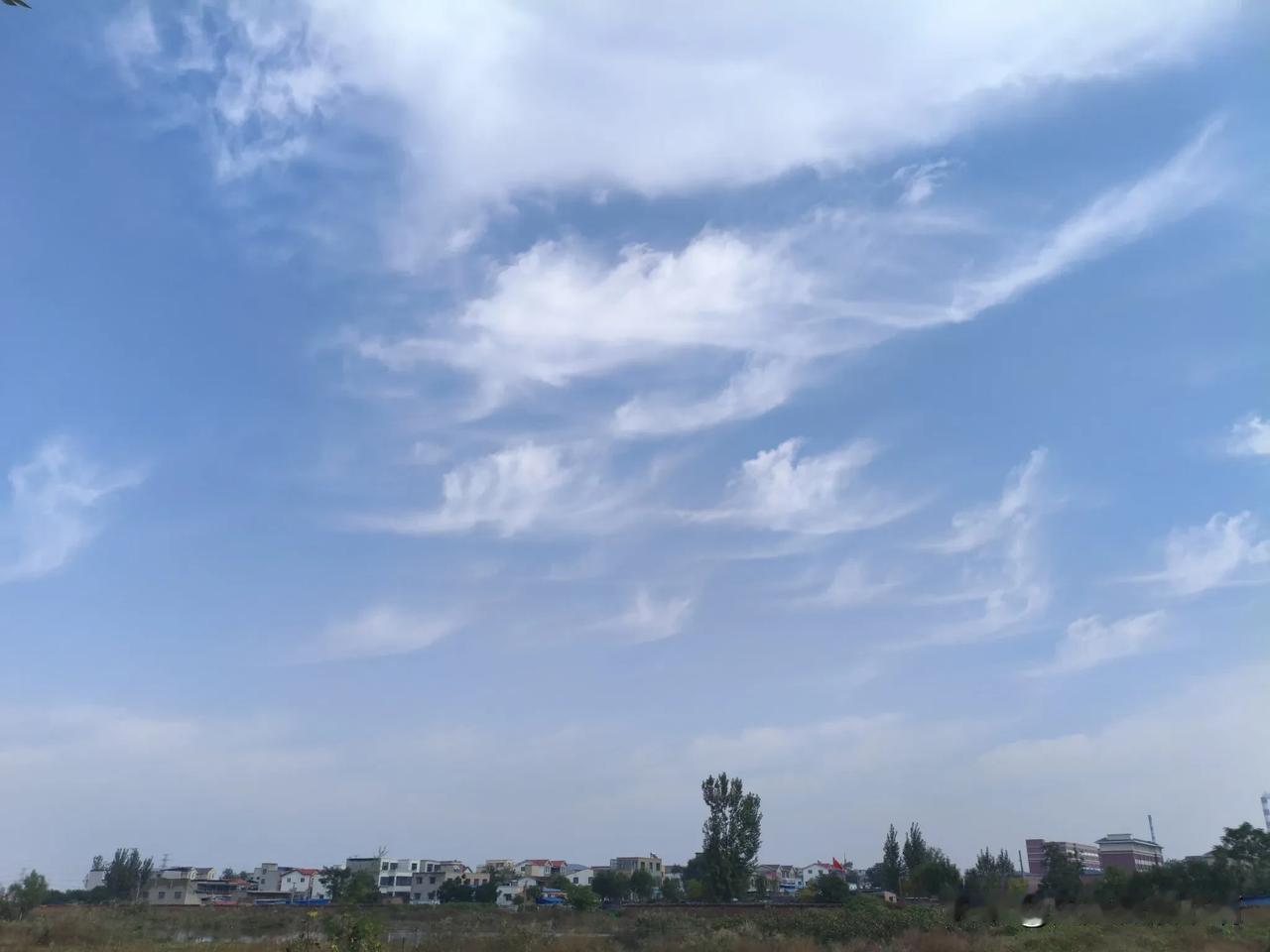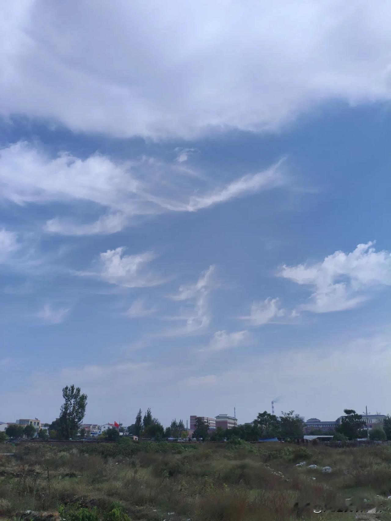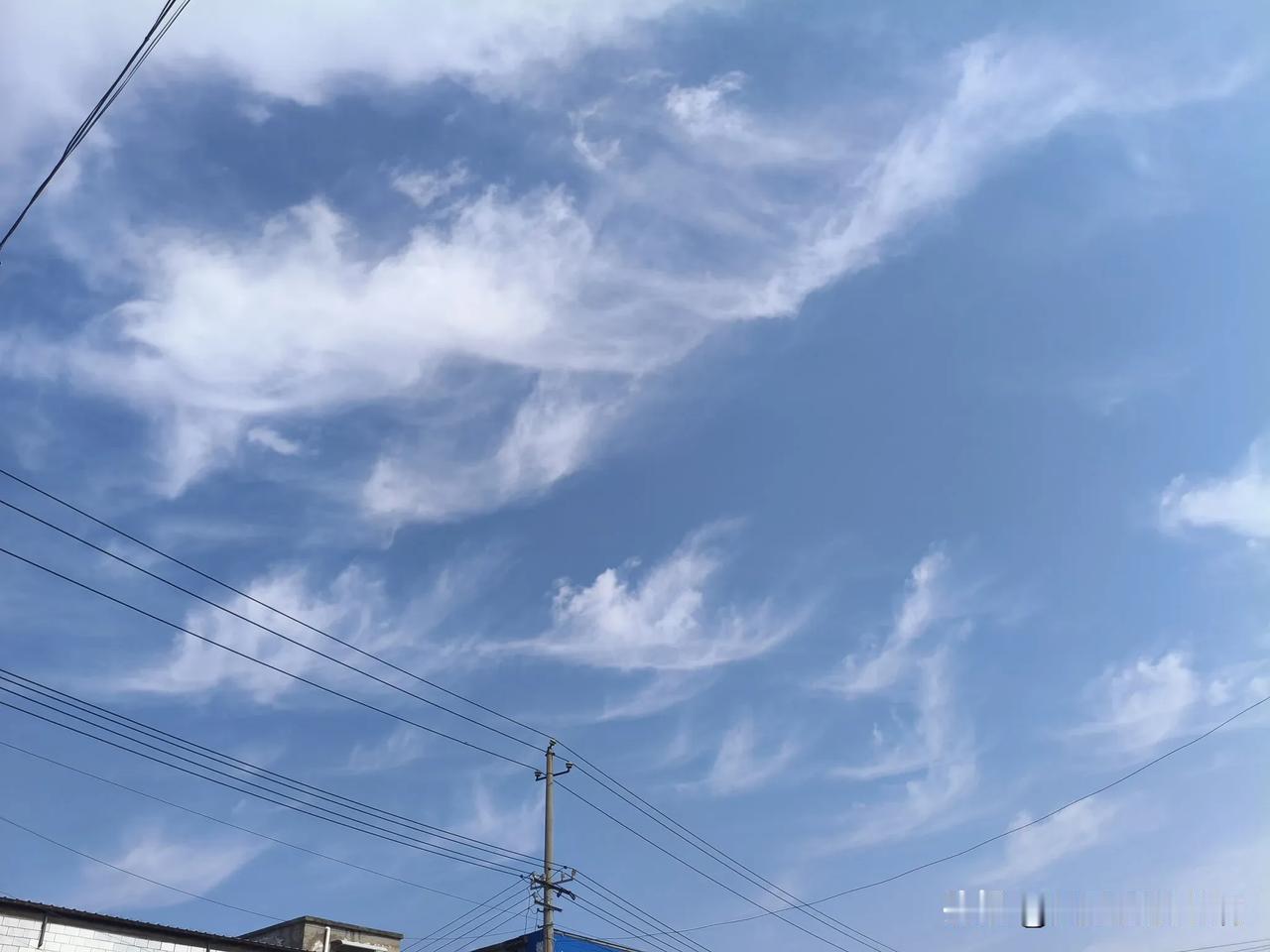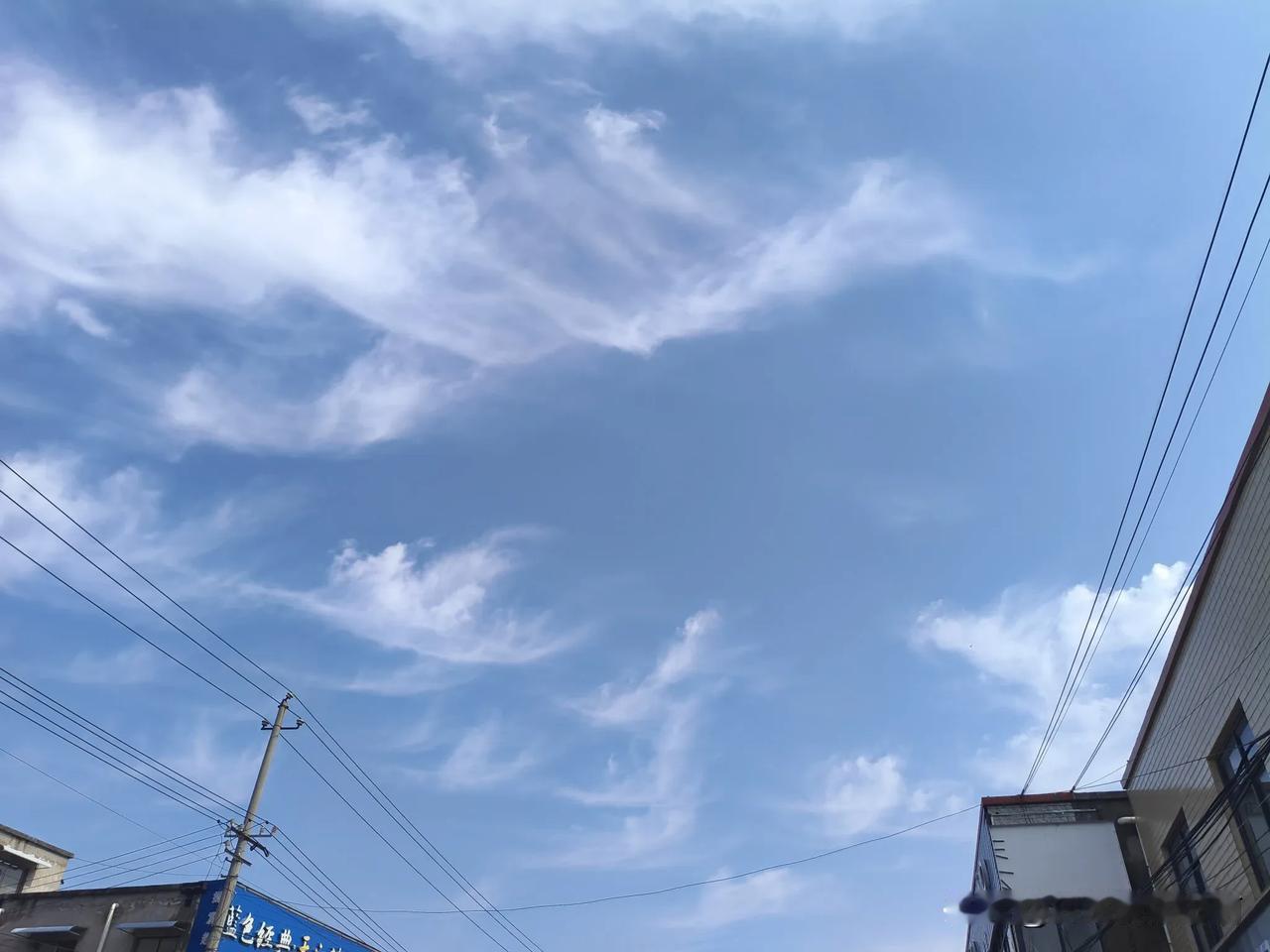 买东西,抬头就忽然看见天空上飘着几朵碎碎的云。 刚开始并不觉得什么,再仔细一看,这些云嗯一片一片的散落在天上,有点像凤凰! 于是就停车驻足,拿出手机对着天空开始拍摄。 可是因为街道不够宽广,虽然两边的楼房都不太高大,但是仍有许多电线挡住了视野。 于是又往前行找到那种比较开阔的地方,拍了几张照片。 我在想天空本来就是很美的,只不过是被很多东西挡住了视线,而且我们又很少去看天空,很少去欣赏这美丽的景色,很少去注意这云朵。 天空又是谁的画布,又是谁整天以云朵为线条,又是谁在天空上肆意的铺墨? 我也不太清楚,我只知道这个画家很有才华,因为天空就是他的画布。