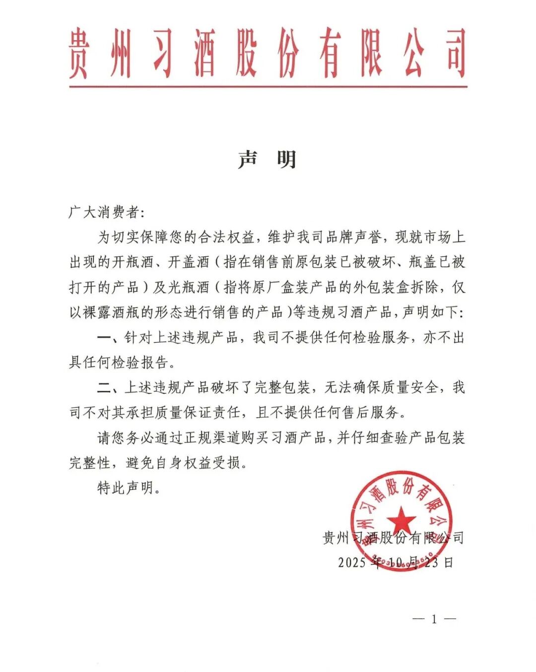 10月23日,贵州习酒在其官网发布声明,表示对开瓶酒、开盖酒、光瓶酒等违规习酒产品,不予提供任何检验及售后服务。详情如下。