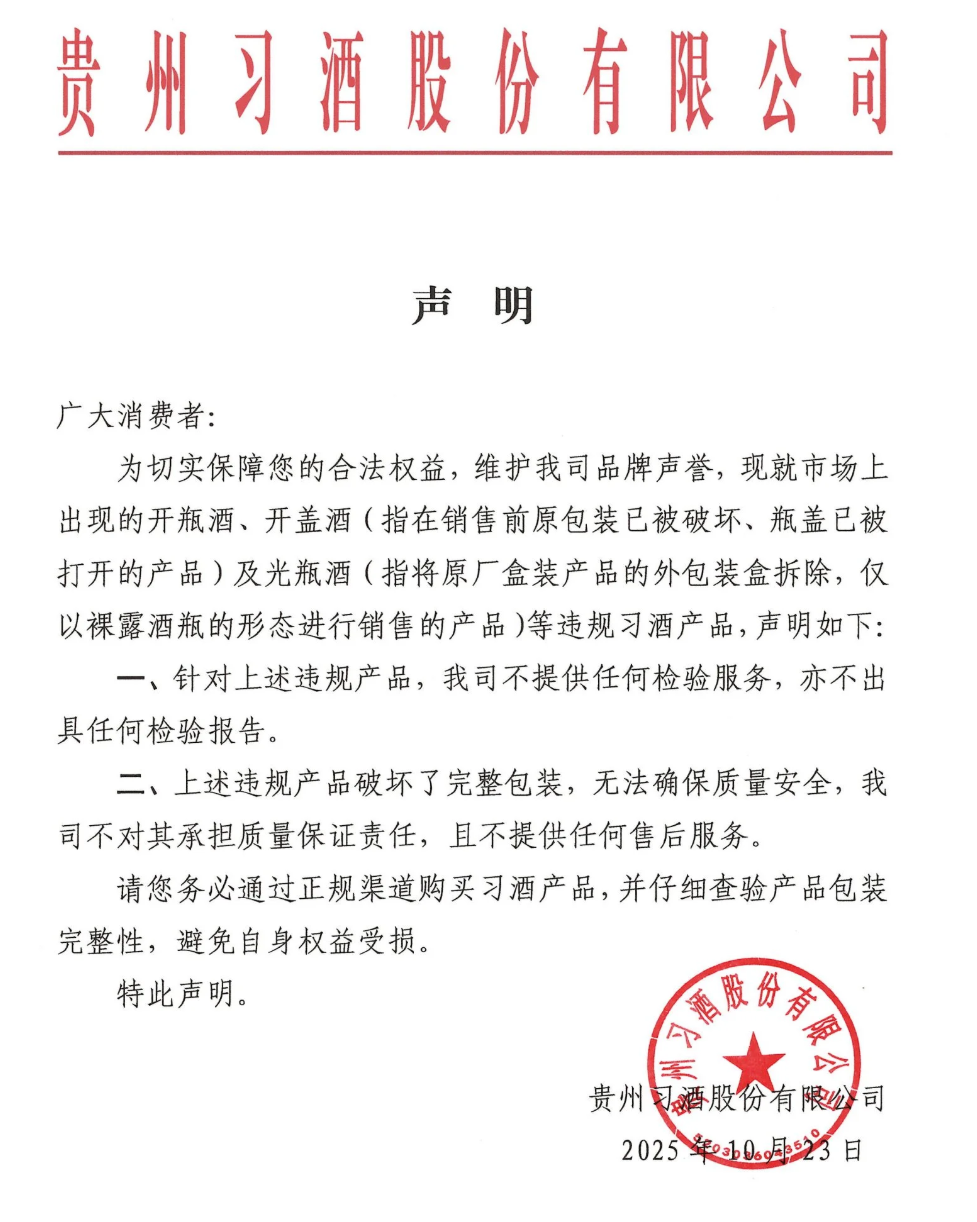 上证报中国证券网讯(记者高志刚)10月23日,贵州习酒股份有限公司就市场上出现的开瓶酒、开盖酒(指在销售前原包装已被破坏、瓶盖已被打开的产品)及光瓶酒(指将原厂盒装产品的外包装盒拆除,仅以裸露酒瓶的形态进行销售的产品)等违规习酒产品,发布一则声明,内容如下: