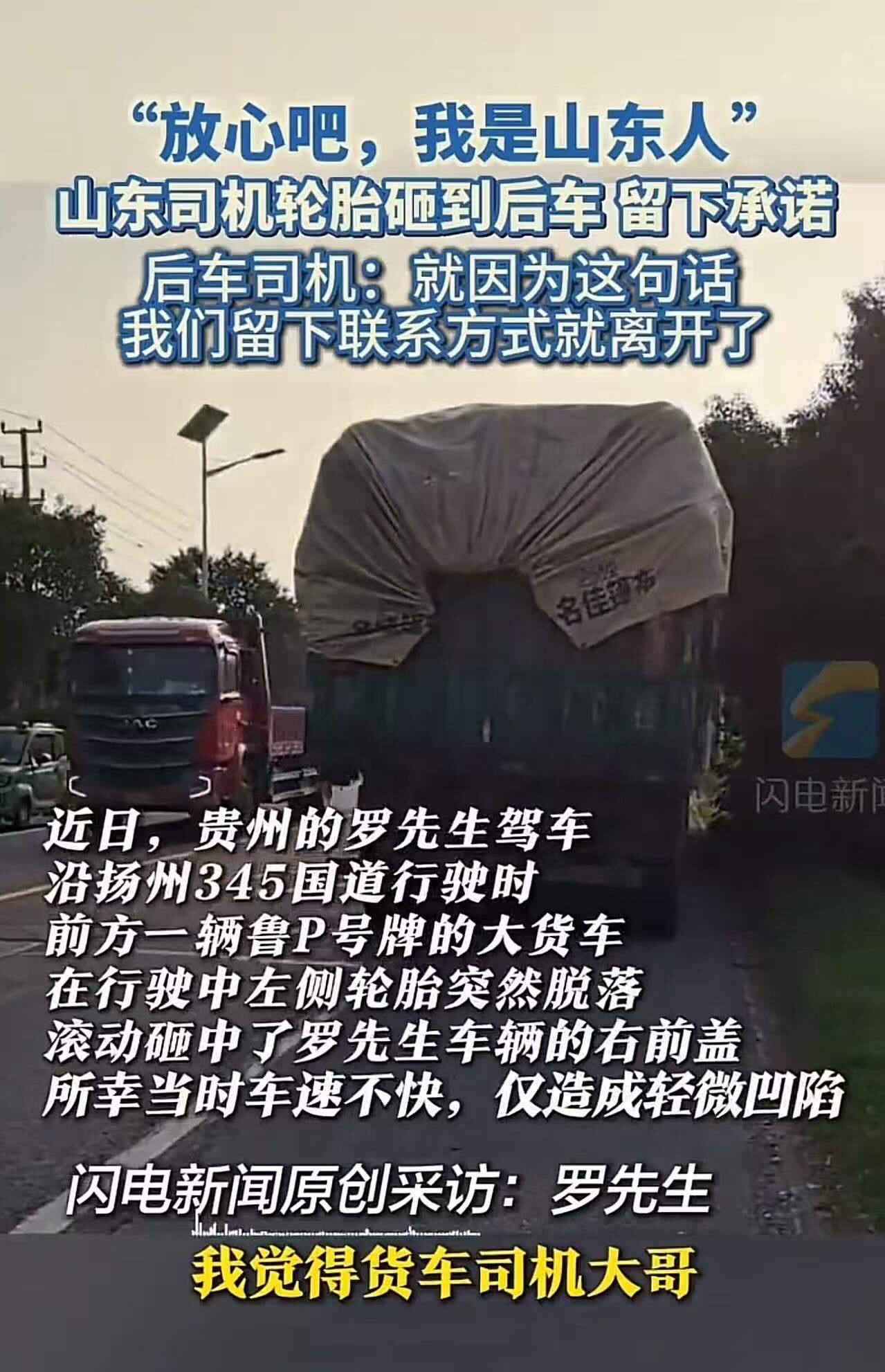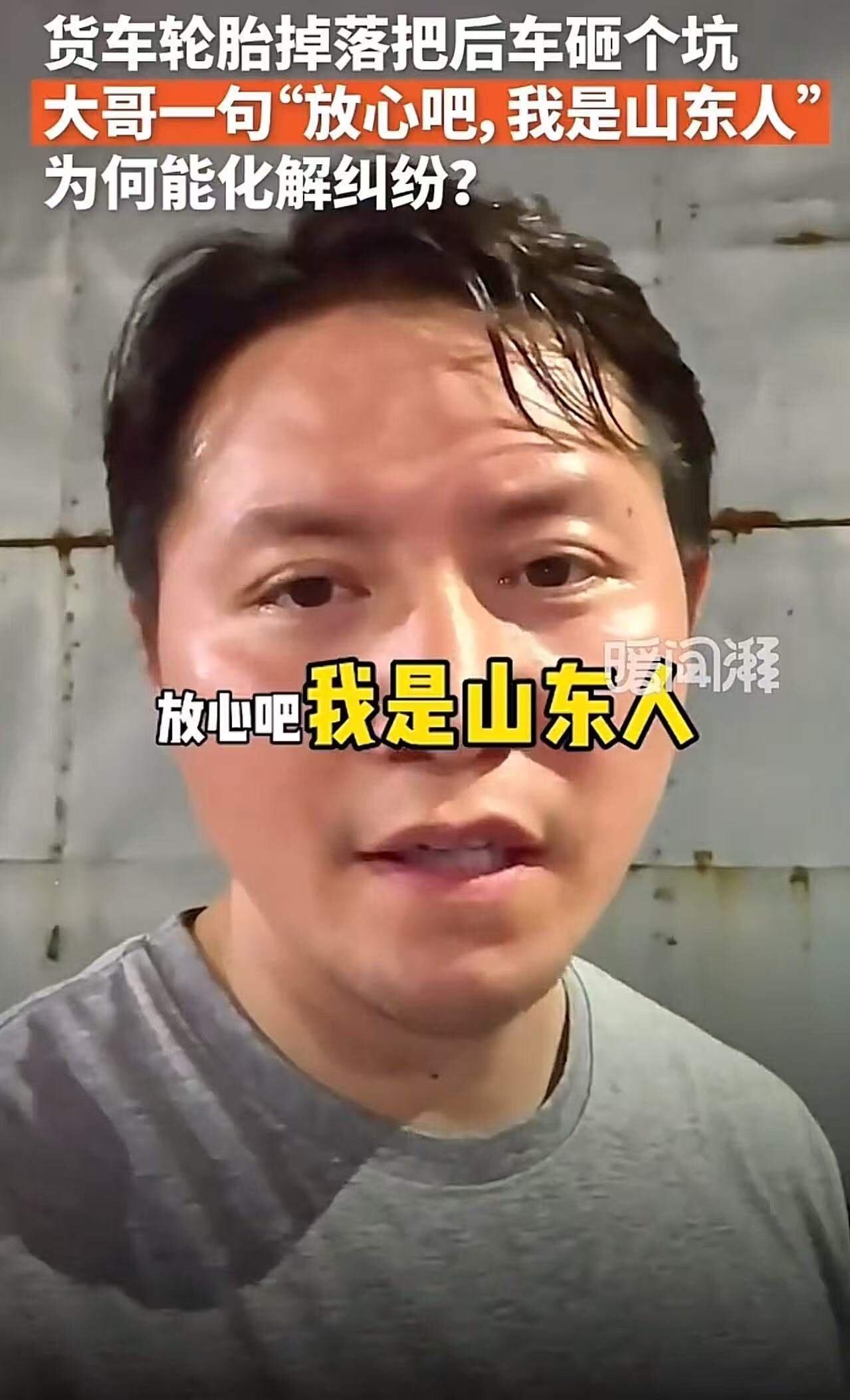 “放心吧,我是山东人!”山东货车司机轮胎脱落砸到后车,留下赔偿承诺后离开。而之后发生的事情,令人意想不到!网友:90%的山东人都很善良,“我是山东人”的含金量很高! 这句简单的话语,成为了事件的转折点,也让人看到了这个省份最真实、最温暖的一面。事情的起因或许只是一次普通的事故:一辆货车轮胎突然脱落,砸到后方的车辆,现场一片混乱。面对突如其来的危险,司机第一时间承诺:“赔偿我负责。”说完,他便匆匆离开,没有推卸责任,没有逃避,反而用一句自豪的话语,化解了现场的尴尬。 然而,事情远没有那么简单。事后,相关工作人员了解情况,发现这位山东货车司机其实是一位平凡而善良的人。没有高调的炫耀,没有谎言的掩饰,他用行动证明了“山东人”的含金量:实诚、善良、负责任。网友们纷纷点赞:“90%的山东人都很善良!”这句话成为网络热议的焦点。有人感叹:“这才是真正的山东精神——朴实、厚道,碰到事儿能担当。”有人调侃:“‘我是山东人’的含金量,比那些虚假的承诺更值钱。” 这件事的背后,折射出一个令人深思的问题:我们的社会,究竟缺少了什么?是责任感?还是那份真诚?在浮躁的时代,这样的善意和坚守,显得尤为珍贵。很多时候,我们都在追求表面的光鲜,却忽略了内心的善良和责任感。而这位货车司机用一句简单的话,告诉我们:做人,最重要的,还是那份真诚和担当。 更让人震惊的是,事后车主的反应也让人感动。他没有因为事故而责怪司机,反而在事件中看到了人性最纯粹的一面。有人说:“这就是中国人最温情的一面——遇到困难,愿意相信善良。”或许,这也是我们这个社会最需要的正能量:用善意去面对每一次意外,用理解去化解每一次冲突。 这件事情告诉我们,善良不一定意味着软弱,责任也不意味着负担。它们是人性最闪亮的部分,是社会最坚实的基石。我们需要更多“我是山东人”的故事,不仅仅是为了彰显地域的骄傲,更是为了唤醒我们心中那份最纯粹的善意和责任感。 所以,下次遇到困难时,不妨多一点耐心和善意,也许你的一个微笑、一次理解,就能让这个世界变得更温暖。让我们一起相信:真正的“山东人”,不只是在这句话里,而是在我们每个人的心里,都藏着一份不变的善良和担当。山东交通事故 高速上轮胎掉了 山东司机 山东伤人事件 轮胎脱落 山东一司机 淄博轮胎人