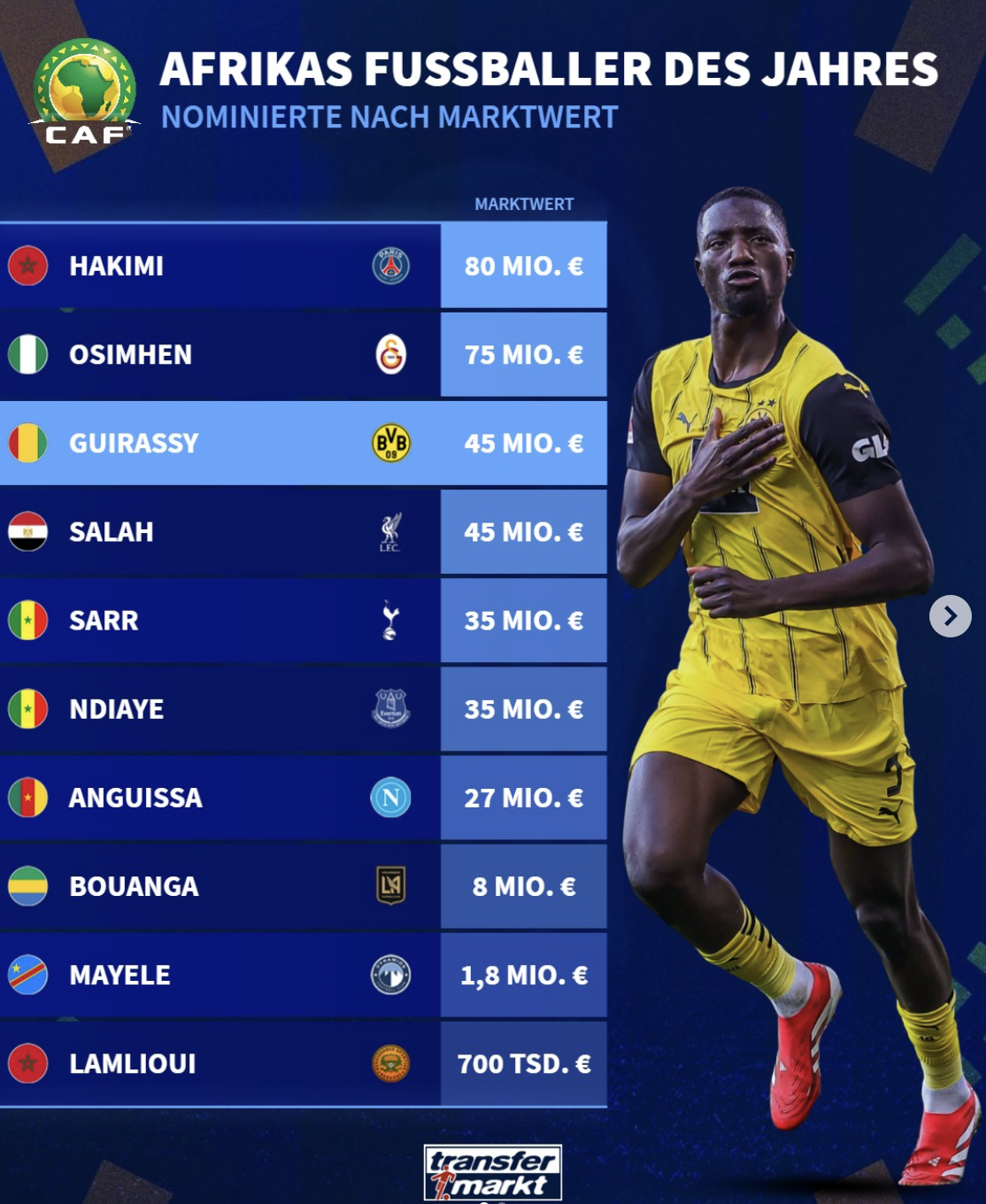 虎扑10月23日讯德转公布了2025年非洲年度最佳球员候选的身价榜。