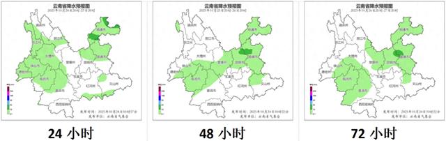 10月24日20时到10月25日20时:昭通市、曲靖市北部阴有小雨局部中雨,迪庆州西部、怒江州、丽江市、大理州、保山市、德宏州、临沧市、普洱市北部、昆明市北部、红河州南部、文山州南部多云有阵雨局部中雨,其他地区多云间阴。