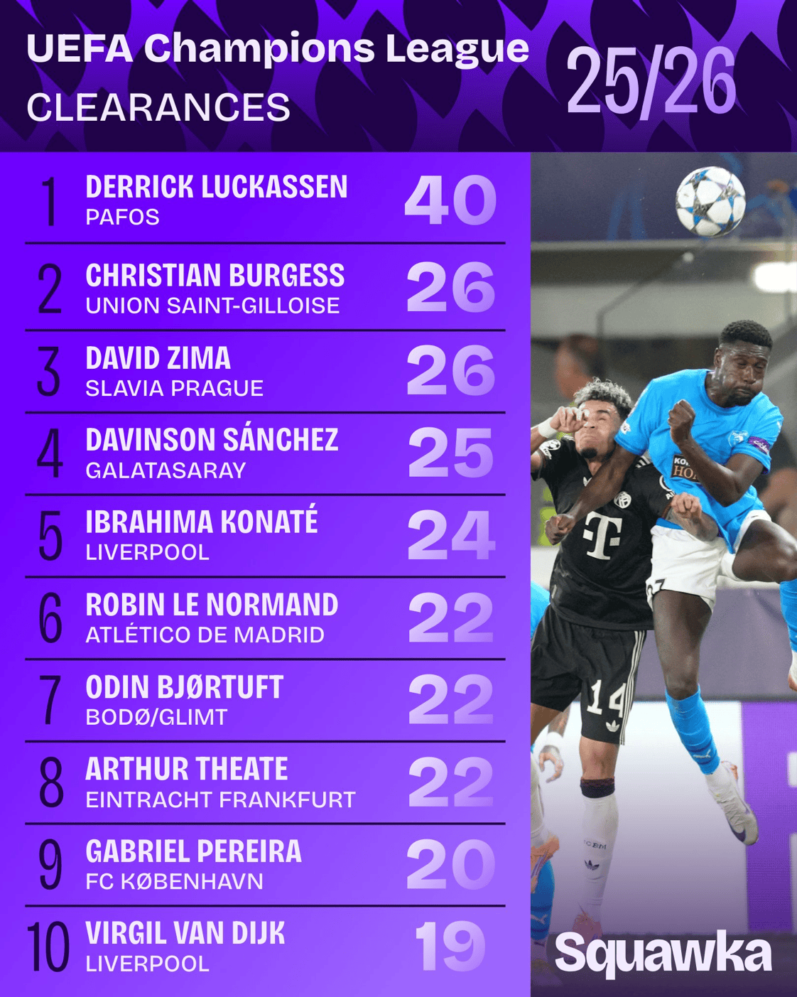 本赛季欧冠解围榜:卢卡森40次居首,科纳特、范戴克前10