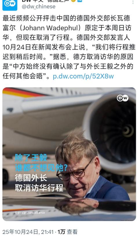 罕见!德国外长妄议台海问题后,访华行程临时取消,德国企业家傻眼了。 德国外长瓦德富尔可能体会了一次什么叫自作自受。当地时间10月24日,德国外交部突然宣布,瓦德富尔原定26日的访华行程突然取消,给出的理由是“无法在中国安排足够多的会议”。 这个借口听起来就像小学生请假说“肚子疼”,谁都知道背后肯定有更深层的原因。果不其然,消息一出,所有人都把目光投向了几天前瓦德富尔关于台海问题的那番不当言论。这下,真相大白了:不是中国没空见她,而是中国不想见她。 这事儿在外交上,其实是一种非常高级的“冷处理”。中国没有公开谴责,没有召见大使抗议,而是用一种近乎“无视”的方式,表达了最强烈的不满。 说白了就是:“你的话触碰了我们的红线,你已经失去了和我们平等对话的资格。”这种外交上的羞辱,比任何激烈的言辞都更让人难受。 瓦德富尔本想来中国秀一下存在感,展示一下欧盟的“价值观外交”,结果连门都没进去,就被晾在了门外。这记耳光,打得无声无息,却又响亮无比。 真正傻眼了的,是德国的企业家们。他们可能正满心期待着外长的这次访问,希望能借此机会缓和一下紧张的气氛,为他们在中国的生意铺平道路。 大众、宝马、巴斯夫、西门子这些德国工业的巨头,哪个不是把中国当作最重要的市场和增长引擎? 他们在中国投资了数百亿欧元,建了无数的工厂和研发中心,他们的未来和中国的经济深度绑定。结果,瓦德富尔一番“政治正确”的言论,直接让他们的希望泡了汤。 他们眼睁睁地看着外长把通往中国的大门给“砰”地一声关上了,自己却只能在旁边干着急,心都凉了半截。 这就暴露了德国政府内部巨大的撕裂。以瓦德富尔所属的绿党为代表的一些政客,脑子里装的都是意识形态,他们紧跟美国的步伐,把中国视为“系统性对手”,总想在人权、台湾等问题上搞点小动作,彰显自己的“道德高地”。而以总理朔尔茨为代表的务实派,则深知德国经济的命脉在哪里。 他们明白,跟中国脱钩,对德国来说就是经济自杀。朔尔茨去年顶着巨大压力,第一个带着庞大的企业家代表团访问中国,就是想稳住这个最重要的合作伙伴。现在,瓦德富尔的所作所为,无异于在总理背后捅了一刀。 这次事件,也给所有西方国家提了个醒:中国的耐心是有限度的,尤其是在核心利益问题上。台湾问题,就是那条绝对不能触碰的红线。 你可以跟中国谈生意,谈合作,甚至可以吵吵架,但如果你想挑战“一个中国”原则,那对不起,对话的大门随时可以关上。 中国用行动告诉世界,我们欢迎合作,但我们绝不接受威胁和胁迫。我们的大门是敞开的,但前提是你要带着诚意来,而不是带着傲慢和偏见。 瓦德富尔的这次“翻车”,其实是一个缩影。它反映了整个西方世界在面对一个崛起的中国时,那种既想合作又想对抗的矛盾心态。 他们一方面离不开中国的市场和供应链,另一方面又恐惧中国的崛起会挑战他们的霸权地位。这种纠结,让他们在对华政策上摇摆不定,时而强硬,时而缓和,最终常常是搬起石头砸自己的脚。德国企业家的“傻眼”,就是这种政策混乱最直接的受害者。 那么,问题来了。各位朋友,你们觉得,在当前这种复杂的国际形势下,一个国家的政治家,应该优先考虑意识形态的“正确”,还是国家经济的“饭碗”?当外交官的言论损害了国家企业的利益时,谁应该为这个后果负责?这种“政冷经热”的局面,还能持续多久?欢迎在评论区留下你的看法。