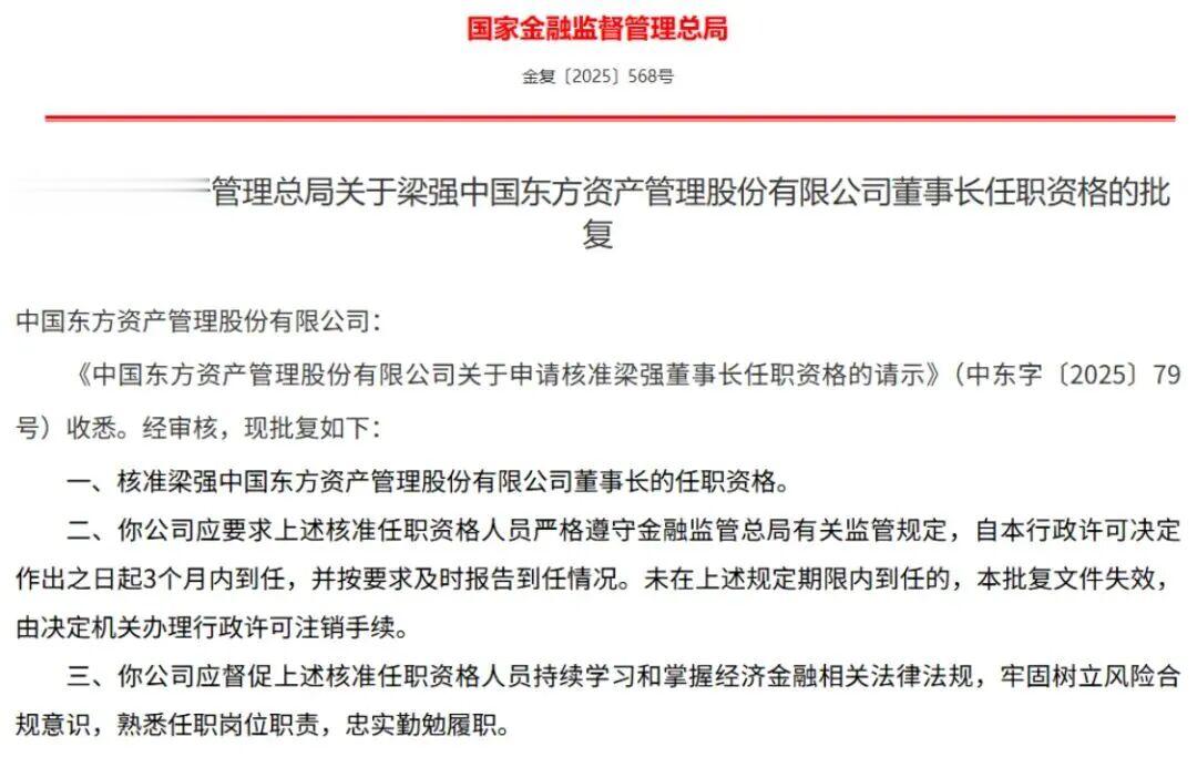 近日,金监总局批复,核准梁强中国东方资产管理股份有限公司董事长的任职资格。54岁的梁强正式掌舵中国第二大金融资产管理公司,面临的挑战和难度不亚于彼时执掌中国华融。