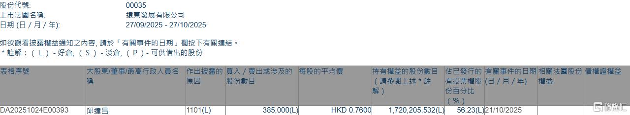 格隆汇10月27日丨根据联交所最新权益披露资料显示,2025年10月21日,远东发展(00035.HK)获执行董事邱达昌在场内以每股均价0.76港元增持38.5万股,涉资约29.26万港元。