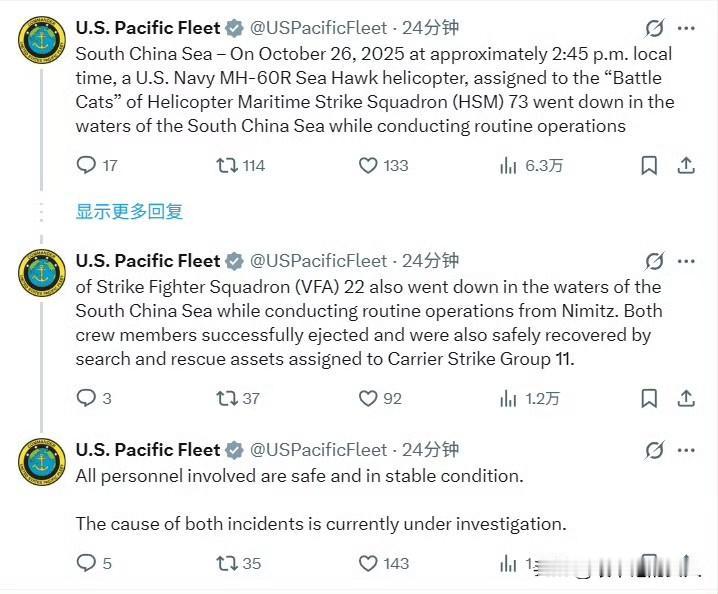 中了![捂脸] 天上“掉飞机”了,民主党议员的话验证了,白宫可以“开门”了!历史罕见!1个小时2架美军机在南海相继坠毁,美军回应也来了! 字少事大,美国防部已经坐不住了,据媒体报道,在会谈前,美国派了两艘航母到南海来耀武扬威呢? 这不,一下子,一个小时摔了两架飞机。这无论如何是向国际社会,向关心美军的网友,向在马来西亚开会特朗普政府交代不过去的。 请注意时间点,天上“掉飞机”是在昨天,然而,昨天正好是特朗普到达马来西亚时间,他还出席了一系列会议和活动。 当然,美军也给回应了,人没事,逃出来了。我在想,不会是飞行员自导自演的吧? 补充,民主党议员曾说美联邦政府要想结束“停摆”,除非“天上掉飞机”。