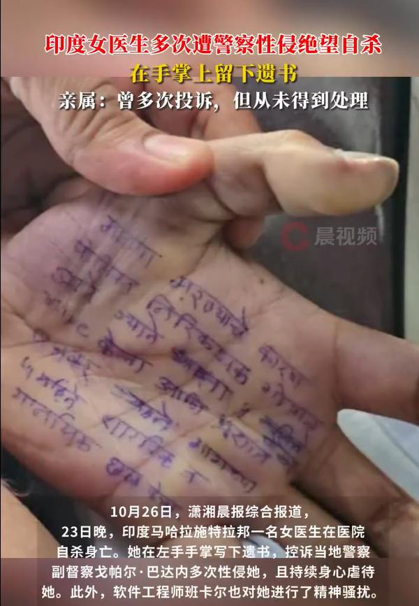 还是印度!近日,印度女医生遭警察多次性侵绝望自杀,而在她的手掌上被发现写有遗书。 该名女医生不仅仅被当地警察副督察戈帕尔·巴达内多次性侵和虐待,还被另一名软件工程师精神骚扰,且从6月份她就开始写信申诉,一直没有得到任何回应,直到最后她选择了绝望自杀。 不得不说,如果不是到了万不得已的情况下,该女医生不会选择以极端的方式结束自己的生命。而类似恶劣的性侵和强奸案件,在印度频发。 可以说,印度国内的强奸、性侵犯罪势头高发,难以遏制,一方面很大程度上和印度国内所谓的生殖崇拜等有关。 另一方面,印度女性在国内通常被视为二等公民,男女因为性别的不同而导致的人格的不平等也是助推性侵和强奸犯罪高发的很重要的一个因素。 第三就是印度的现有法律对于强奸犯罪的纵容,如果不被曝光,不引发关注,很多类似案件会因为证据不足等导致犯罪嫌疑人逍遥法外。 印度电影《因果报应》就是聚焦了印度的强奸性侵犯罪,因为女儿被强奸性侵而得不到公平的结果,憨厚老实的底层父亲以身设局,为女复仇。该片把女性遭遇性侵犯罪的不公平对待以及印度存在的现实问题凸显得淋漓尽致,管中窥豹可见一斑。