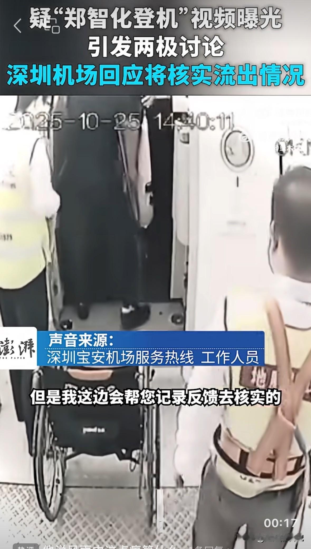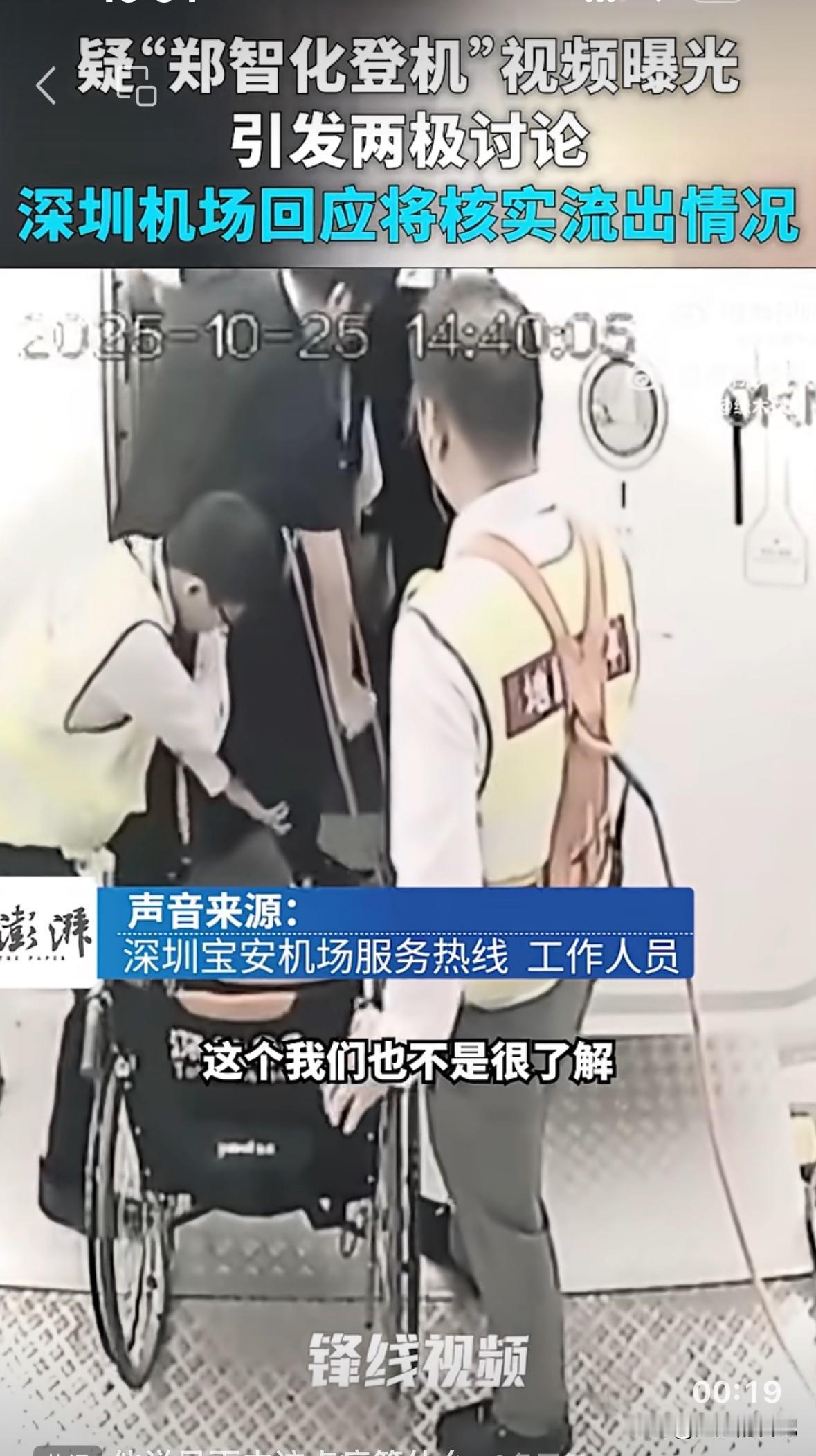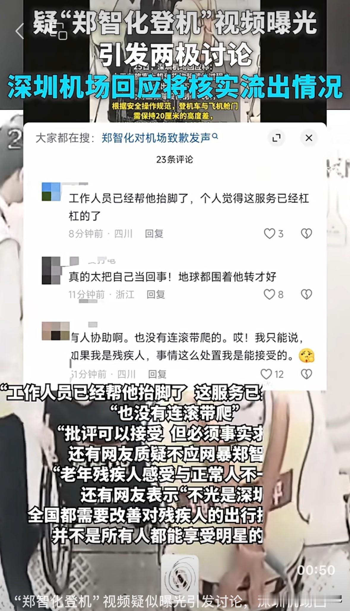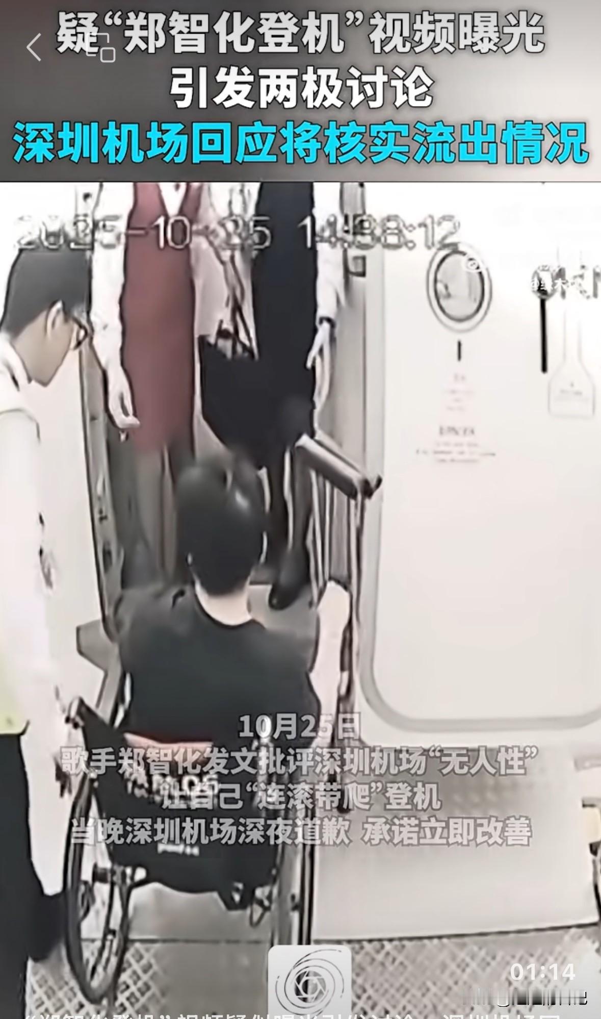 郑智化事件出现大反转,机场现场视频曝光,真相让人愤怒。 郑智化之前在社交媒体发文,痛斥机场漠视他,最后导致他连滚带爬的进入到飞机,真相是。 工作人员土豪着他的轮椅到机舱口,机上空姐结果他的手提包,工作人员几次努力都没给他推入到机舱,最后,工作人员把郑智化搀扶起来,郑智化站起来,站稳之后,工作人员蹲下用手帮忙抬起他的左脚,左脚站稳后,又蹲下帮他抬起他的右脚,视频转到机舱里对门口对位置,他稳稳当当的走入机舱,所谓的连滚带爬在哪里? 这样无德,诋毁我们的艺人,就没安好心,缺钱就回来圈钱,还不知道感恩,不感谢工作人员也就罢了,这样诬陷工作人员,让人心寒。 事实就摆在那里,不容你诋毁喝诬陷,道歉也不值得被原谅,因为他是故意的。太坏了。