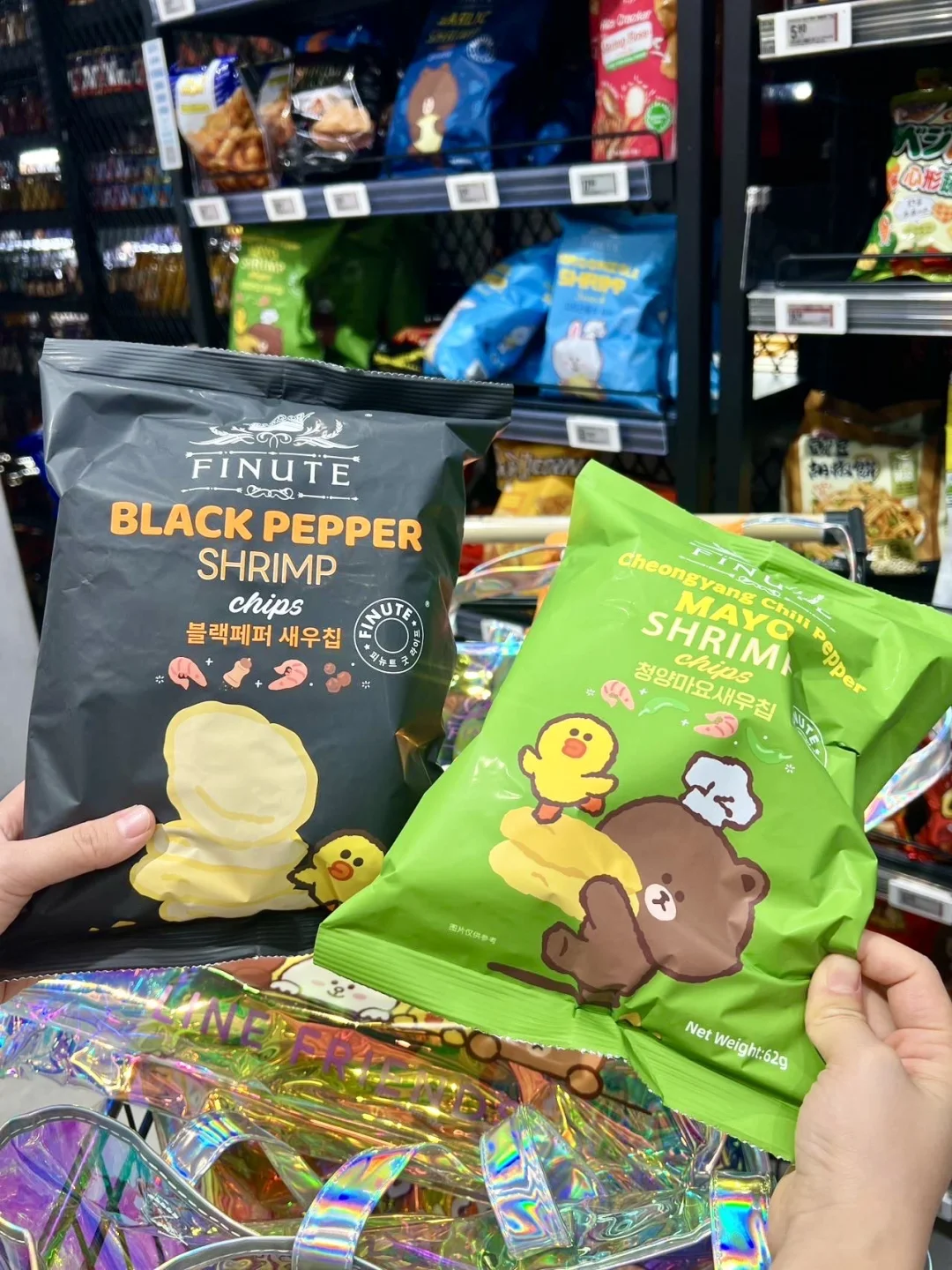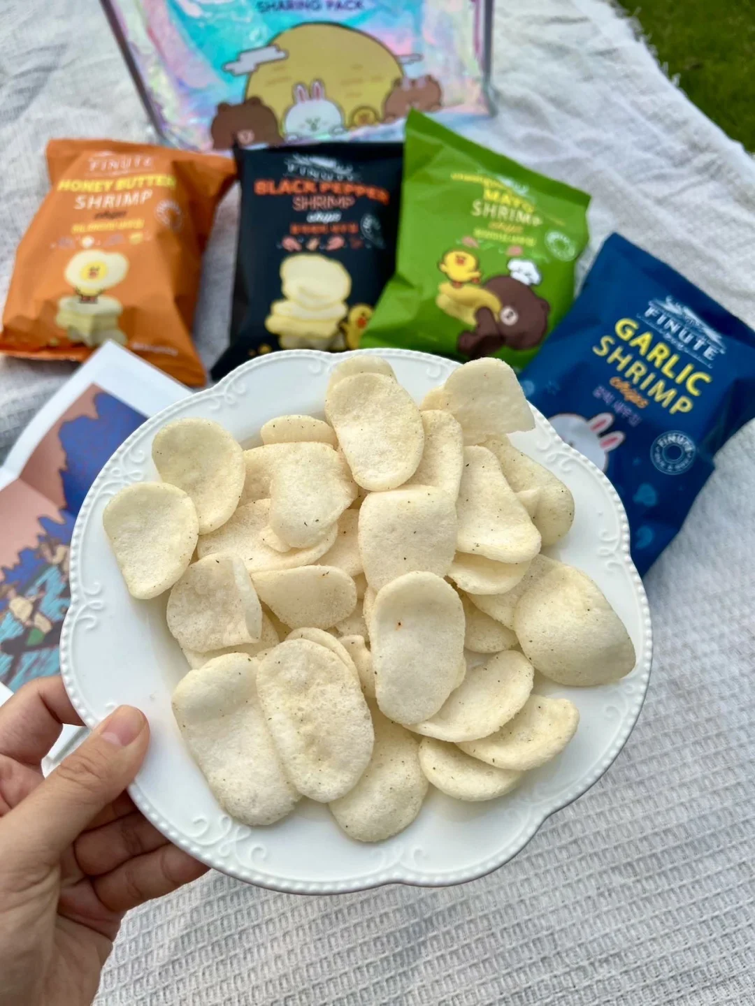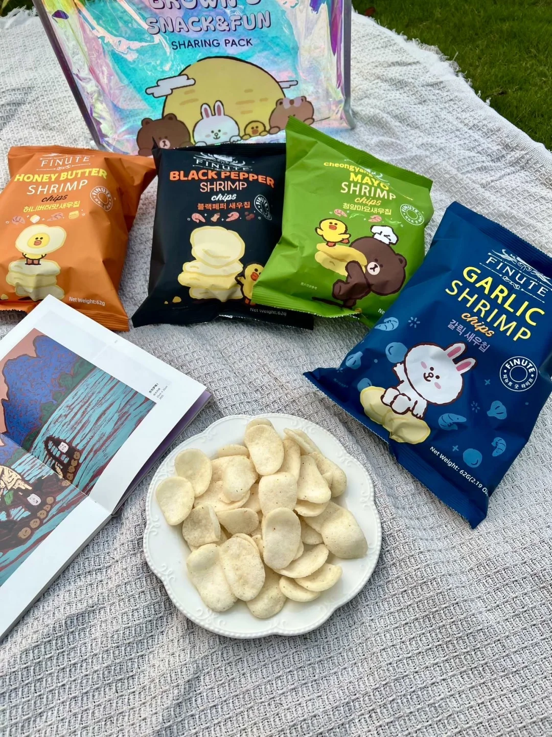 在盒马闲逛时无意间捞到的宝藏 FINUTE布朗熊联名虾片礼盒 镭射包装在阳光下闪着彩虹光 还没拆开就被颜值暴击💘 撕开包装那刻真的惊到—— “哗”地涌出浓郁虾香!” 看了成分表才发现用了13%真实虾肉 难怪鲜味这么足!🦐 超大份248g贴心地分了4小包 现在秋游随手塞一包在帆布包里 完全不用担心受潮或者吃不完 62g的份量简直是随身零食黄金比例✨ 四个口味都长在我的味蕾上: 🌶️ 青阳辣椒蛋黄酱——辣劲过后浮起沙沙的蛋黄香 🍯 蜂蜜黄油——像把融化的太妃糖裹在云朵上 🧄 经典蒜香——每片都挂着细密调料,吃完偷偷嗦手指 ⚫ 黑胡椒——微微辛辣勾着继续伸手去掏下一片 最惊艳的是它的薄脆度! 咬下去的瞬间能听见“咔嚓”声在齿间炸开 接着浓郁的鲜味就漫上舌尖 坐在野餐垫上不知不觉就消灭半包 闺蜜直接抢过去把封口扎紧(笑) 现在它已经晋升为我的秋日必备清单: 爬山时揣一包补充能量 公园长椅上看落叶时当零嘴 甚至办公室下午茶拆一包 整个部门都会循着香味凑过来… 这种能提升幸福感的小零食 才是秋天最对味的打开方式呀🍁