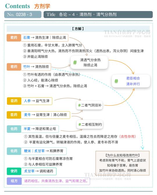 🟠首先,去掉知母是考虑到有胃气不和,胃气上逆的症状。知母偏于苦寒,易伤胃,所以加竹叶来协助透热,同时清心除烦