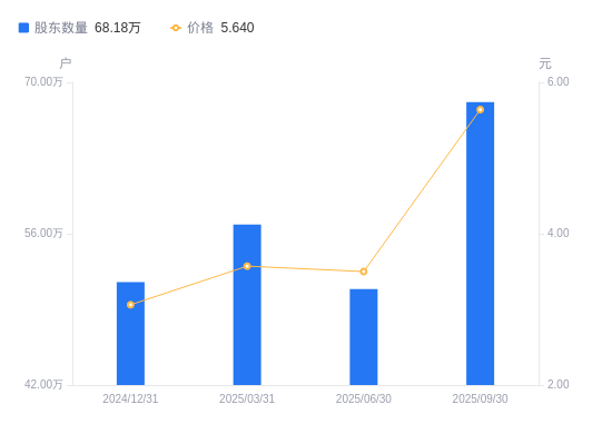 10月28日消息,数据显示,截至2025年9月30日,利欧股份A股股东总户数为68.18万户,较上期(2025年6月30日)增加17.3万户,增幅34.00%。公司最新A股总股本为67.72亿股,其中流通A股58.5亿股,户均持有流通A股数量为8580.31股,较上期减少2917.37股,降幅25.37%;户均持流通A股市值4.84万元,较上期增加8151.07元,增幅20.26%。