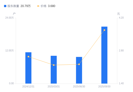 日期A股户数(户)流通A股户均持股数(股)户均持股市值(万元)2025-09-3020790910640.853.922025-06-309718722763.635.052025-03-3110154421786.904.772024-12-3111426019362.244.932024-09-3010562020946.124.422024-06-3010621621323.453.622024-03-3111024920914.644.382023-12-3111186520612.504.872023-09-3011630519825.614.982023-06-3011383220256.326.25