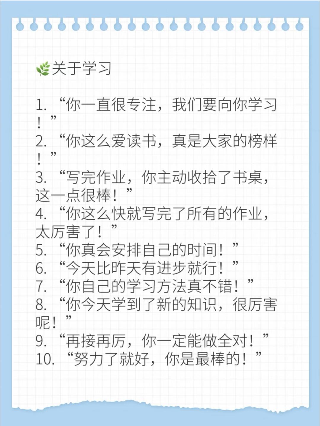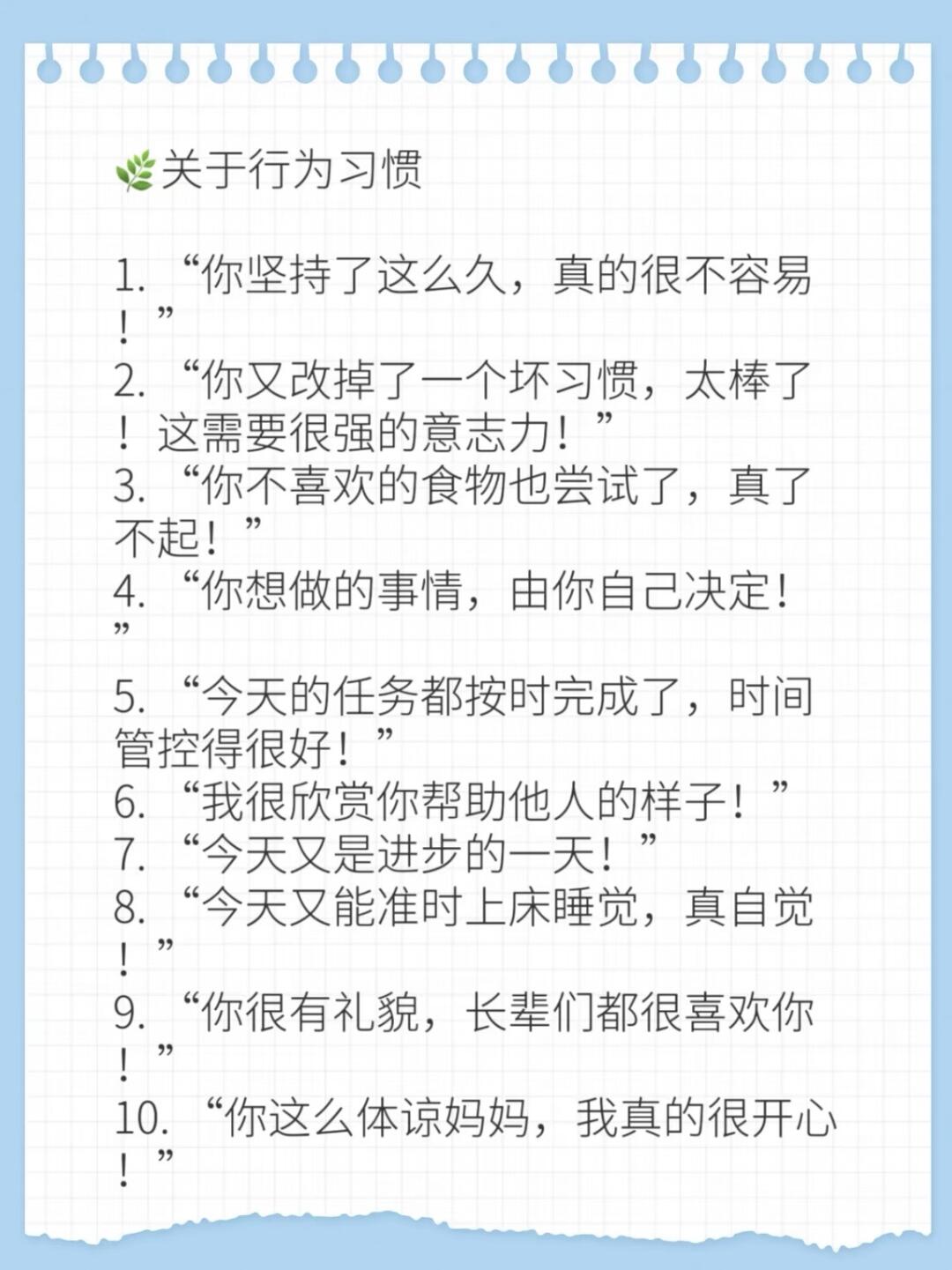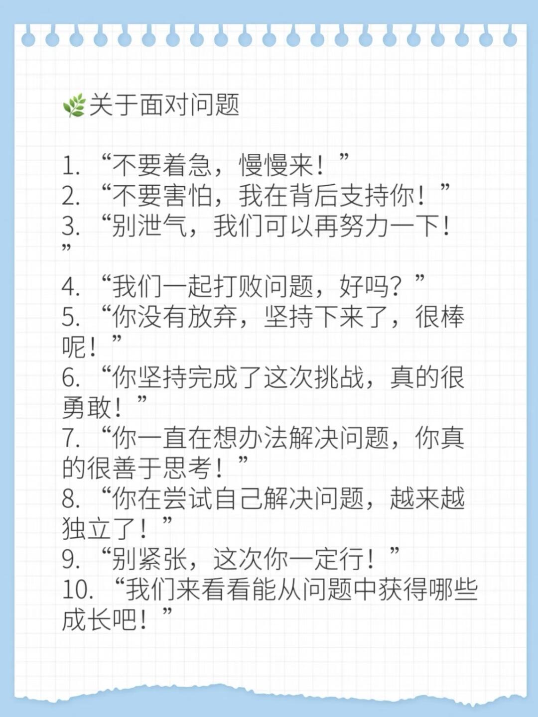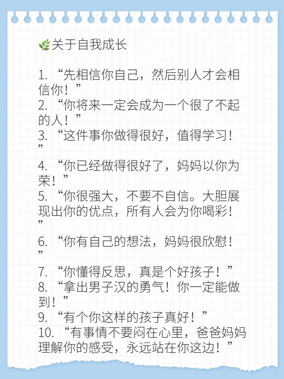 父母的说话方式藏着孩子一生的性格 温暖有力量的语音,是孩子的人生底色 想养出什么样的孩子,就多说什么样的话 · ✅鼓励孩子表达情绪的话: 1.不开心可以哭,不用憋着 2.发泄情绪没关系,但不能伤害关心你的人 3.这件事没做好,你很难过吧,我能理解 4.你有点不高兴,需要我陪你吗 5.不开心可以扔枕头,可以在自己房间大喊 · ✅鼓励孩子自信的话: 1.虽然没有成功,但你学到了本领 2.虽然比赛输了,但努力过就值得 3.永远相信自己是个好孩子,哪怕被人否定 4.当你被人夸奖时,你能大方接受,并道谢 5.当你做错事时,你能勇敢承认,并改正 · ✅鼓励孩子上进的话: 1.你取得了进步,和你的努力分不开 2.你一定很用心,妈妈看到你进步很快 3.坚持下去,你会发现自己更强 4.你想要的自由,靠你不断自律获得 5.你的梦想不难,需要你努力去争取 · ✅培养孩子拒绝能力的话: 1.别人让你感到不舒服,可以表达出来 2.当你无法帮助别人时,及时告知对方 3.不想答应别人的请求,可以委婉地拒绝 4.当你不想分享玩具时,可以礼貌地拒绝 5.可以拒绝父母和老师,但前提要尊重他们 · ✅教孩子正确交友的话: 1.怂恿你做危险事的朋友,不能交 2.总是贬低嘲笑你的朋友,不能交 3.总是威胁打击你的朋友,不能交 4.常常嫉妒你的朋友,不能交 5.情绪常常失控的朋友,不能交 · ✅鼓励孩子独立的话: 1.自己洗的草莓更甜 2.遇到事情先自己尝试,实在不会再来找我 3.箱子打不开,你有别的办法吗 4.每天整理好书桌,你很有条理 5.这个有趣的提问,你是怎么想到的 · ✅培养孩子底线教育的话: 1.平安成长比成功更重要 2.当生命受到威胁时,可以忽略一切规则 3.不要为任何事伤害自己的身体 4.如果一段关系让你感到不堪,勇敢放手 5.学习是你自己的事,不要推给父母 · ✅培养孩子规则的话: 1.用过的东西请放回原位,这是习惯 2.不要在公众场合大吵大闹,这是素质 3.不要打断别人说话,这是尊重 4.别人的东西不要拿,这是教养 5.吃饭时不要用筷子搅来搅去,这是礼仪 · ✅培养孩子有主见的话: 1.妈妈想听听你的想法 2.虽然不是每次尝试都成功,但会离成功越来越近 3.虚心思考老师和同学对你的评价,但不必盲从 4.如果你不喜欢一件事,在别人下次做之前说出来 5.当你需要迎合哪位朋友时,试着找机会离开