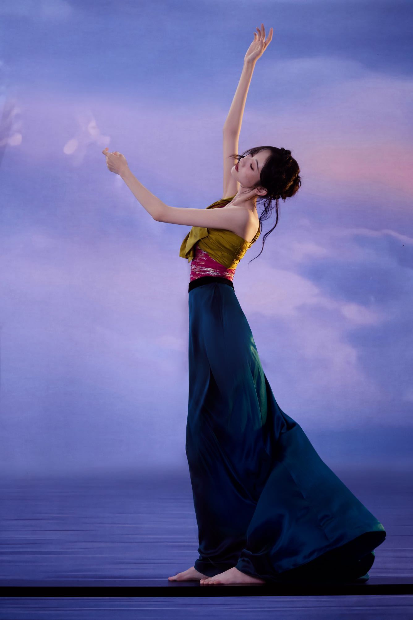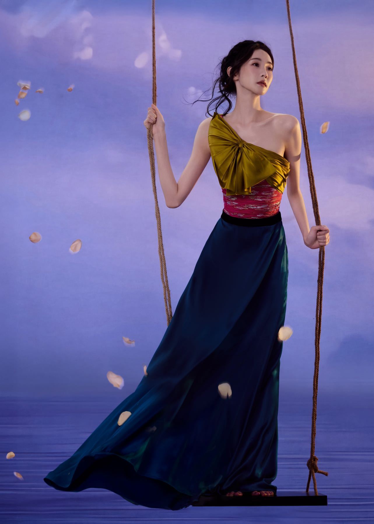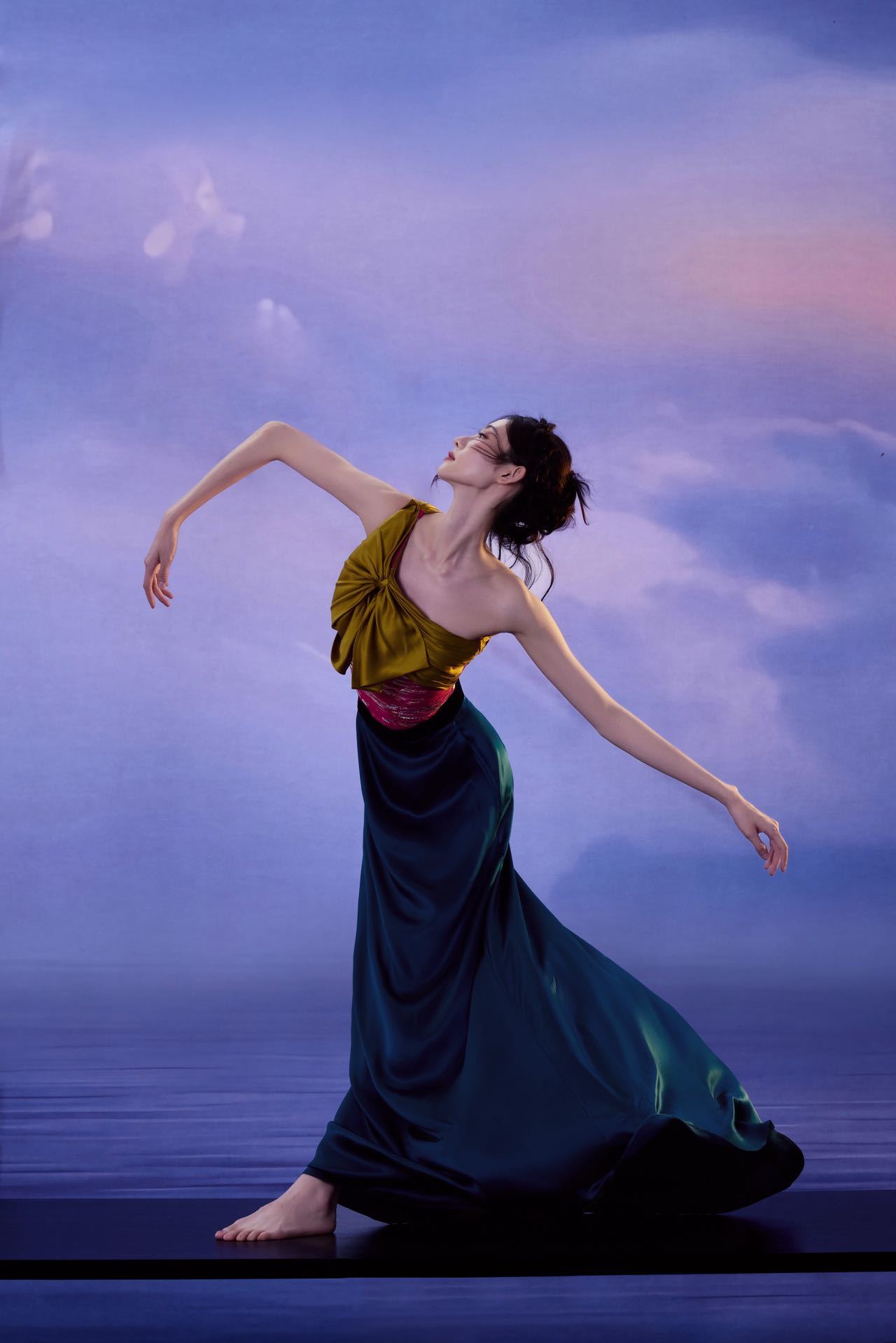 粉银星河抹胸与墨绿绸缎裙摆的碰撞,叠加胸前跳跃的明黄蝴蝶结,细碎银光倾泻肩头,墨绿光泽流转裙间。
