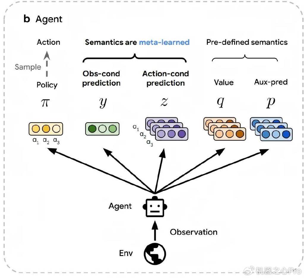 该团队没有采用手工设计的方式,而是定义了一个没有预定义语义、富有表现力的预测空间,并通过使用元网络进行元学习,来找出智能体需要优化的内容。他们希望在保留表征现有强化学习算法中核心思想能力的同时,也支持广阔的新颖算法可能性空间。