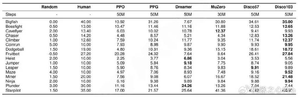 具体来说,该团队使用了由Atari、ProcGen和DMLab-30基准组成的103个更具多样性的环境,发现了另一个规则Disco103。该规则在Atari基准上表现相似,同时之前所示的每一个已见和未见的基准上都提高了分数。特别是,Disco103在Crafter上达到了人类水平的表现,并在Sokoban上接近了MuZero的SOTA性能。