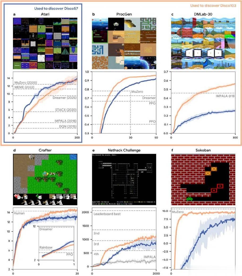 该团队还进行了大规模实验,结果发现这一「自动发现的规则」在经典的Atari基准测试上超越了所有现有方法,并且在若干它从未见过的高难度基准测试上也优于多种SOTA强化学习算法。