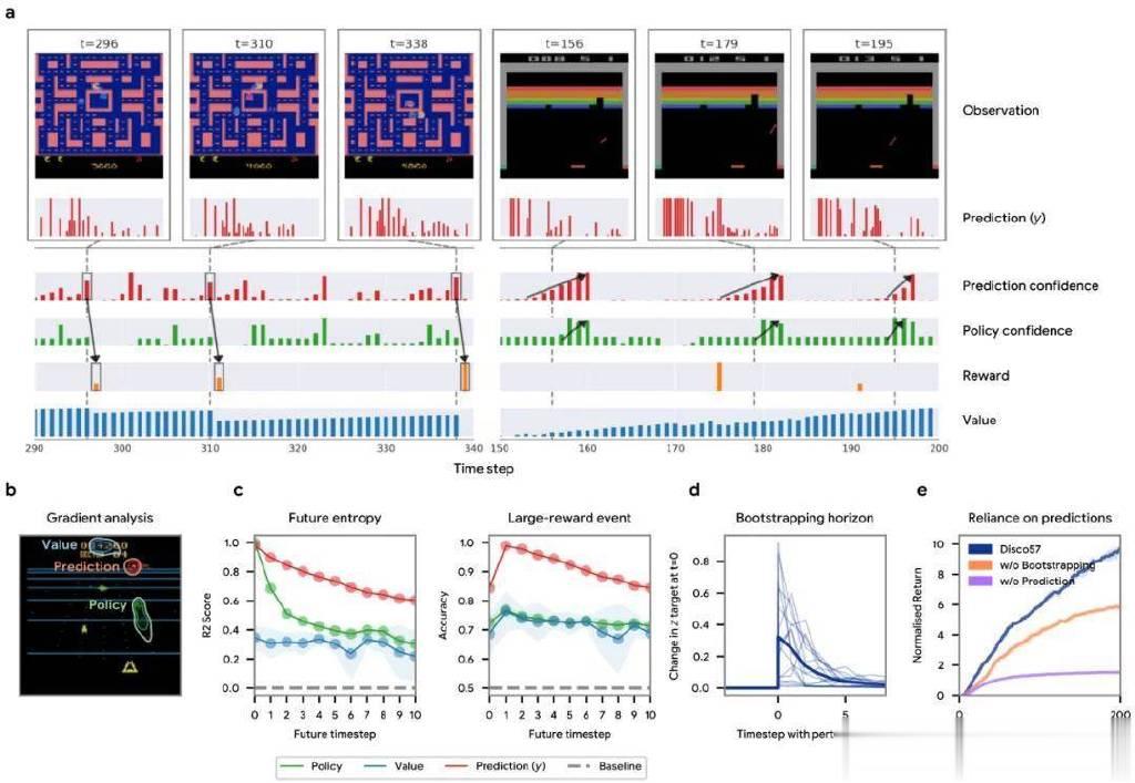 该团队还通过测量与观测的每个部分相关的梯度范数,研究了观测中的哪些特征会导致元学习的预测产生强烈反应。图b的结果显示,元学习的预测倾向于关注未来可能相关的物体,这与策略和价值函数所关注的地方不同。这些结果表明,DiscoRL已经学会了在一个适度的范围内识别和预测显著事件,从而补充了诸如策略和价值函数等现有概念。