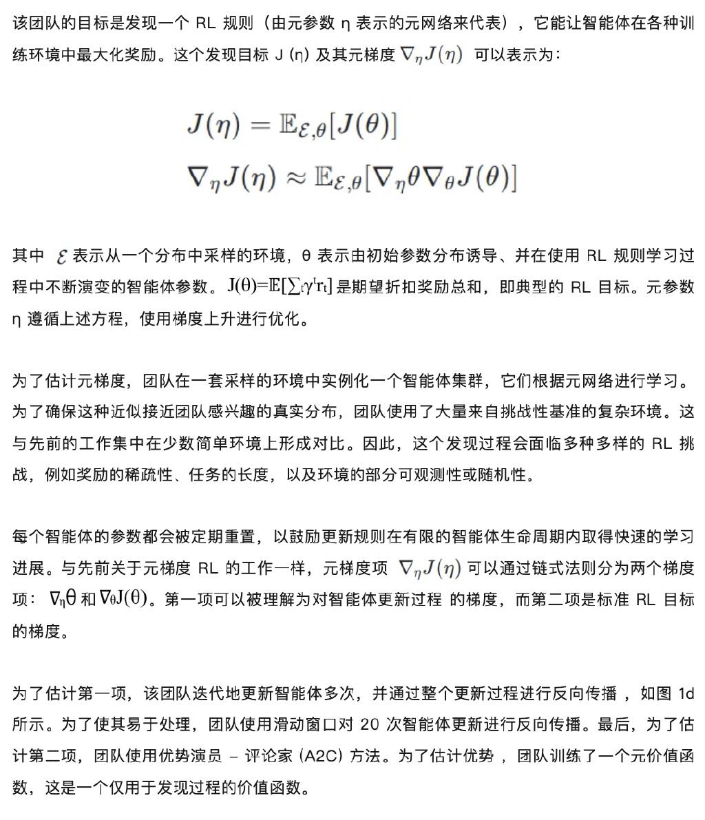 具体到方法上,该团队的思路是:在大量复杂环境中,基于大量智能体的经验积累,进行元学习(meta-learning)。这个方法能够发现智能体在更新策略与预测时所遵循的强化学习规则。