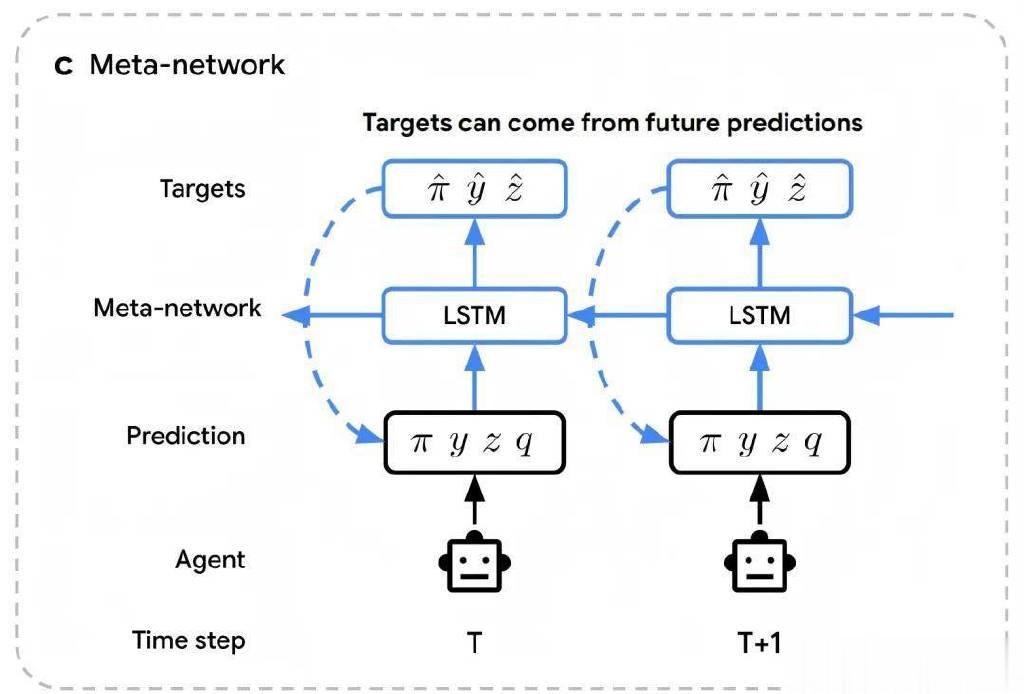 相应地,该团队的RL规则使用一个元网络(图1c)作为函数,来决定智能体应将其预测和策略更新至的目标。为了在时间步t产生目标,该元网络会接收从时间步t到t+n的一段轨迹作为输入,这段轨迹包含了智能体的预测、策略、奖励以及回合是否终止的信息。它使用一个标准的LSTM来处理这些输入,当然也可以使用其他架构。