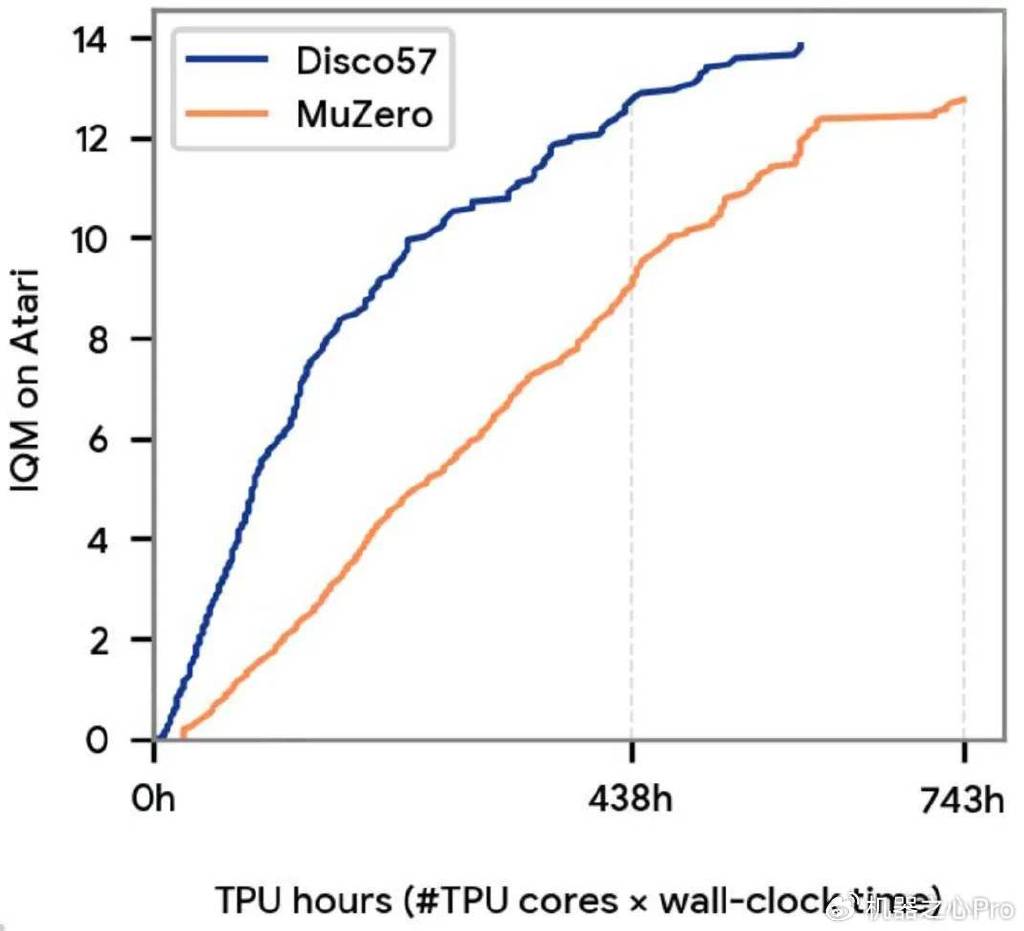 在此评估中,该团队使用的网络架构的参数数量与MuZero使用的数量相当。这是一个比发现过程中使用的网络更大的网络;因此,被发现的RL规则必须能泛化到这种设置。Disco57取得了13.86的IQM分数,在Atari基准上超越了所有现有的RL规则,并且其运行效率(wall-clockefficiency)远高于当前最先进的MuZero(见下图)。