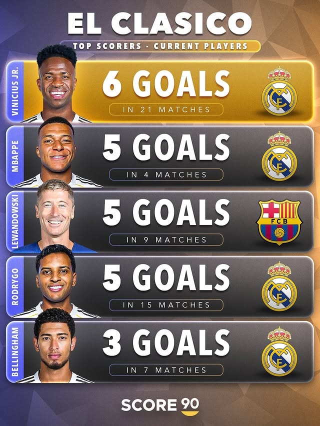 国家德比现役射手榜,维尼修斯6球居首,姆巴佩、莱万、罗德里戈5球并列第2,贝林厄姆3球,TOP5同样只有1名巴萨球员。