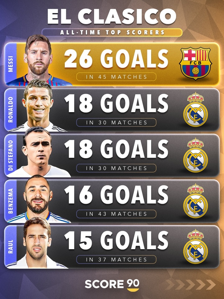 国家德比历史射手榜,梅西26球遥遥领先,C罗、迪斯蒂法诺18球并列第2,本泽马16球,劳尔15球,TOP5仅1名巴萨球员。