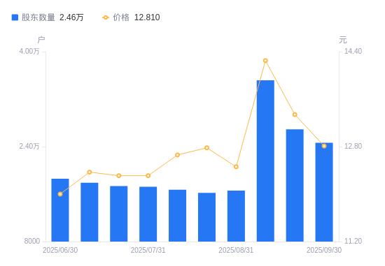 近一年(2024年9月30日至2025年9月30日),欧亚集团A股股东户数从1.56万户,增加至2.46万户,增幅57.82%,区间股价上涨21.65%。