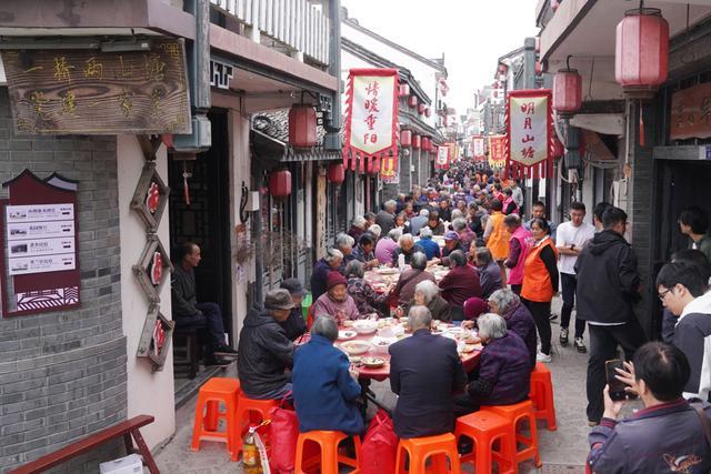 30张大圆桌沿老街依次排开,蒸腾的热气裹着饭菜香弥漫开来,现场蔚为壮观。