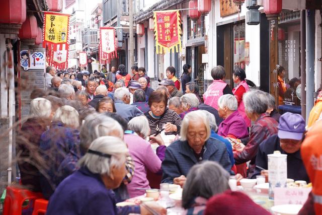 老人们围坐桌边,有的互相夹菜,有的拉起家常,眼角眉梢满是笑意。