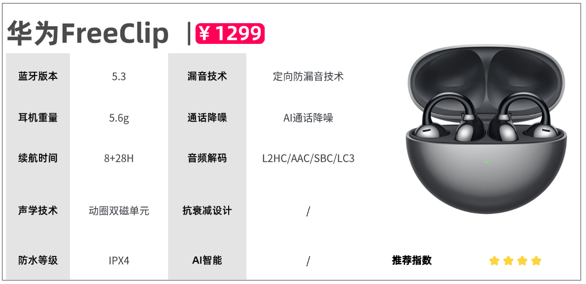 华为FreeClip支持蓝牙5.3及L2HC高清音频协议,与华为生态设备连接时能获得最佳音质与无缝体验。其AI通话降噪技术能有效分离人声与环境噪音。续航方面,单次8小时配合充电盒28小时的表现可靠。