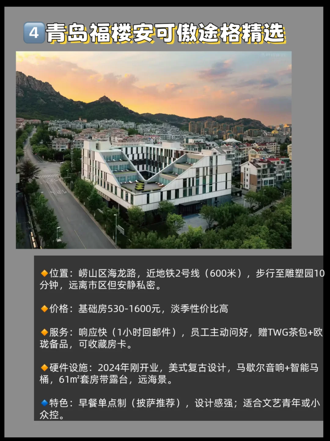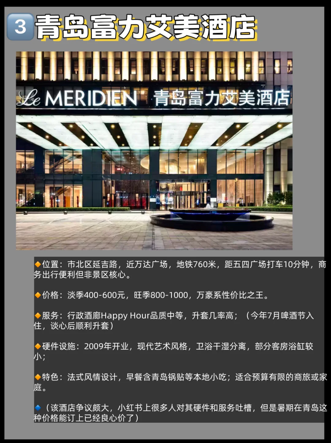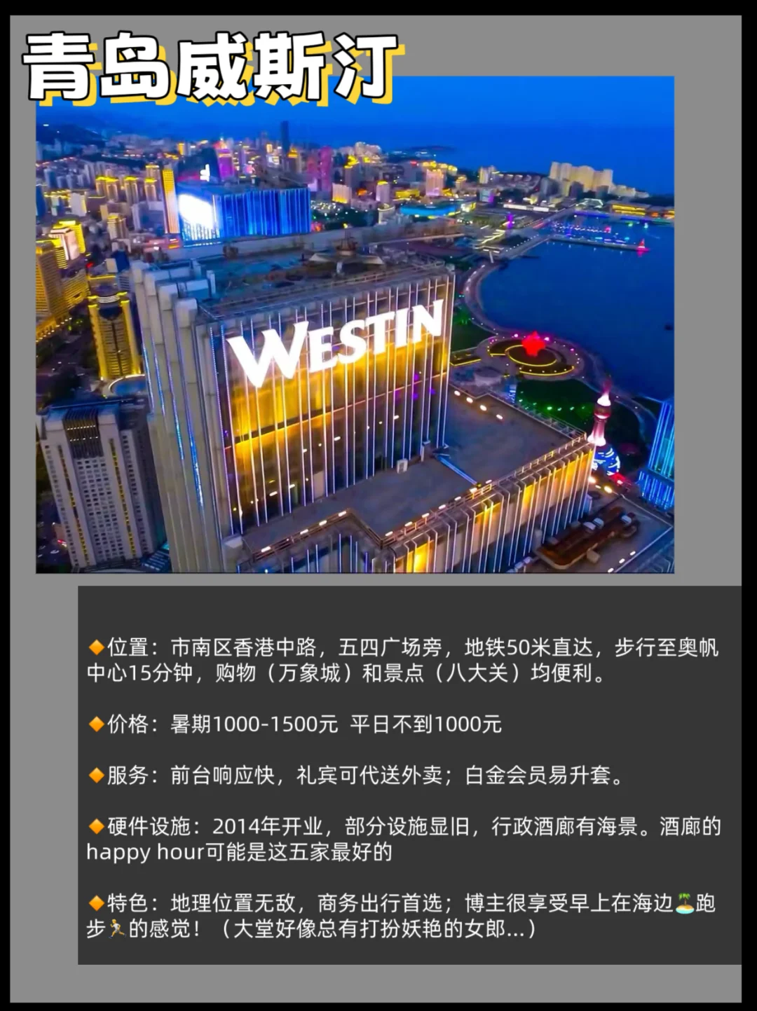 最后提醒一下,黄岛(非老城区)新开了很多万豪系,所以艾美、喜来登、威斯汀,在青岛有老城区和黄岛两处!