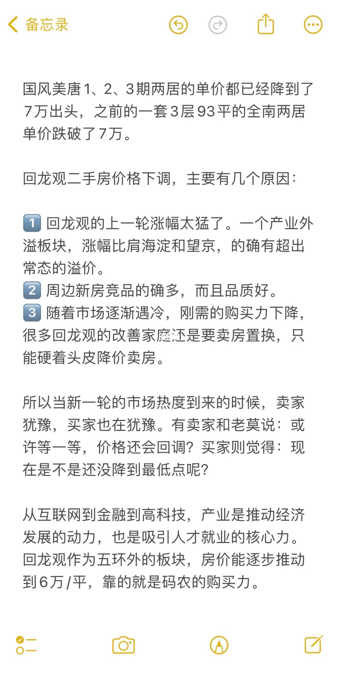 3️⃣ 随着市场逐渐遇冷,刚需的购买力下降,很多回龙观的改善家庭还是要卖房置换,只能硬着头皮降价卖房。