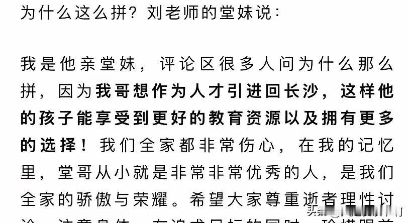 看到评上教授不到一年湘潭大学37岁博导刘昊霖突然去世,我突然悟了: 我觉得最伤心的应该就是他的父母! 含辛茹苦培养孩子这么多年了,学业有成,36岁就评为教授,刚评为教授,一年37岁就离开了人间。 很多报道说,这个孩子多么的优秀,这位老师多么的优秀,有的学生说前一天还在上他的课,第二天人就没了。 活着才是拥有一切的! 父母也是希望你飞黄腾达,也许希望你给他们脸上增光,也许希望你光耀名门,但是最主要的还是你活着,你活着才有一切。 有人说他的离世是因为太过操劳,太过劳累,突发的疾病。 在评论区看到一段堂妹对她的评价说,这个刘老师一直都是家里人,孩子学习的榜样,从小成绩优异,出身贫寒,一路打拼勤奋好学,做到了今天这个教授的位置也是十分的不容易。 但是生命却永远定格在了37岁。 这又让我不禁想起前一段在网络上非常火爆的另外一个堂哥,他的燕儿妹妹说他的堂哥是家族唯一的男丁,从小就游手好闲,油嘴滑舌,好高骛远,一生创业无数却终无所成。 这个妹妹的父亲是三年前死了,然后堂哥一手帮他操办了父亲的葬礼,也是当时的披麻戴孝的人,他的堂哥于今年49岁,脑出血死了,留下了80多岁高龄的父母孤苦无依。 中国人总是喜欢以成败论英雄,那么这个刘教授呢?是成是败呢? 那才是大多数人中人眼中的好孩子,辛辛苦苦上学几十载,最后求得功名入职大学,获得博士又是一年辛辛苦苦,撒手人寰,平生所获荣誉无数,所获赞誉无数,总是家人口中别人家人家的孩子,一路成绩优异,日日辛劳,刻苦学习,不曾懈怠一天。 结局呢,他连那个好高骛远,油嘴滑舌的堂哥都不如。堂哥活了49岁要比他多活了12年,领略了12年的风光,感受了12年的岁月,多享受了12年的生命。 什么成败和英雄,哪有什么光耀门楣和子弟,哪有什么父母的期望,望子成龙,什么别人的褒贬赞誉有那么严重,别人的尊重别人的评价,别人的羡慕别人的嫉妒,别人的夸赞真的有那么重要吗? 倒不如找些自己喜欢的事情,听一首自己喜欢的歌,品一杯茶,抽一根烟,跳一支舞,或者酌一杯酒,去享受这一天美好的生活。 太阳是如此的温暖,微风是如此的和煦,阳光是如此的明媚,心情要变得美丽一些,活着才是最重要的。 你存在世界就在! 你不在了,这个世界一切就不在了,因为你已经不在了。37岁博士去世 湘潭大学
