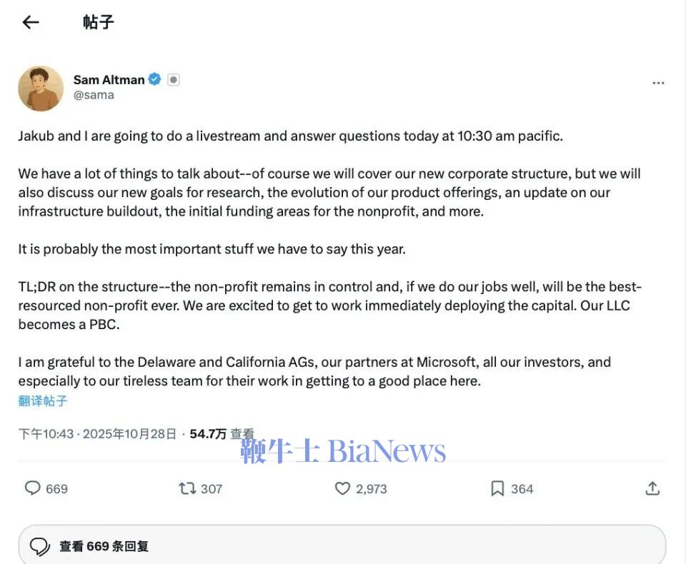 在宣布完成重组的同时,奥特曼在社交媒体平台X发帖,宣布公司已成功完成复杂的重组,并立即投入下一阶段的战略工作。