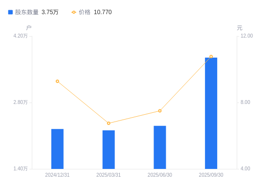 日期A股户数(户)流通A股户均持股数(股)户均持股市值(万元)2025-09-303747512552.3713.522025-06-302308520376.8715.282025-03-312212921257.1714.352024-12-312241020990.6319.482024-09-301412033314.4517.432024-06-301464232126.7614.862024-03-311513731076.1718.102023-12-311763026681.7917.112023-09-301811625966.0018.532023-06-301346834927.2320.31