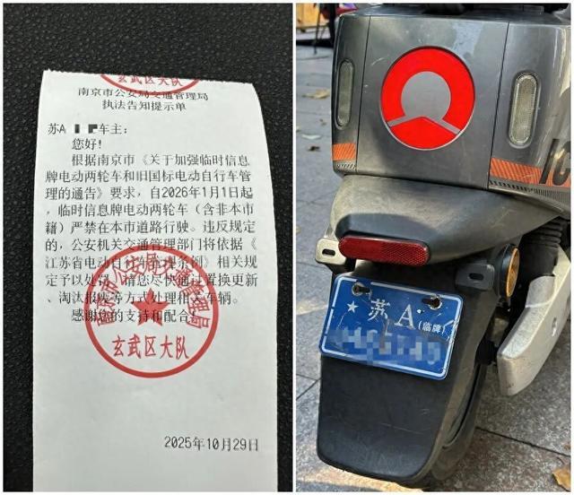 交警解释,去年10月南京市政府多部门联合发布《关于加强临时信息牌电动两轮车和旧国标电动自行车管理的通告》,规定自2026年1月1日起,凡悬挂临时信息牌(含非本市籍)的电动两轮车禁止在南京市范围内道路上行驶。