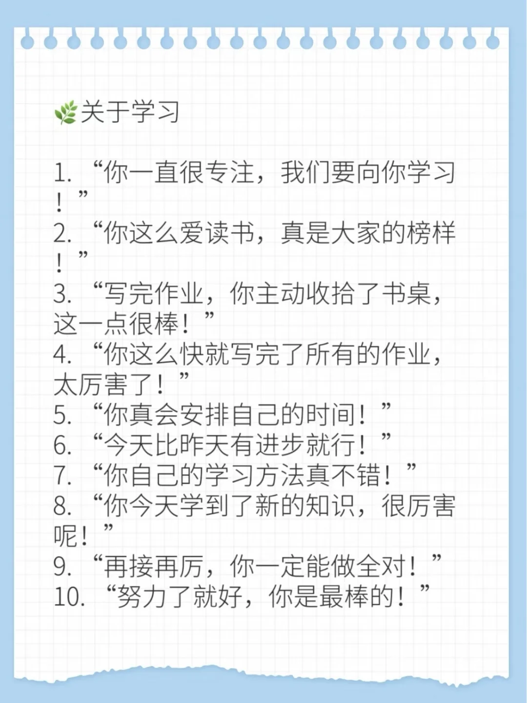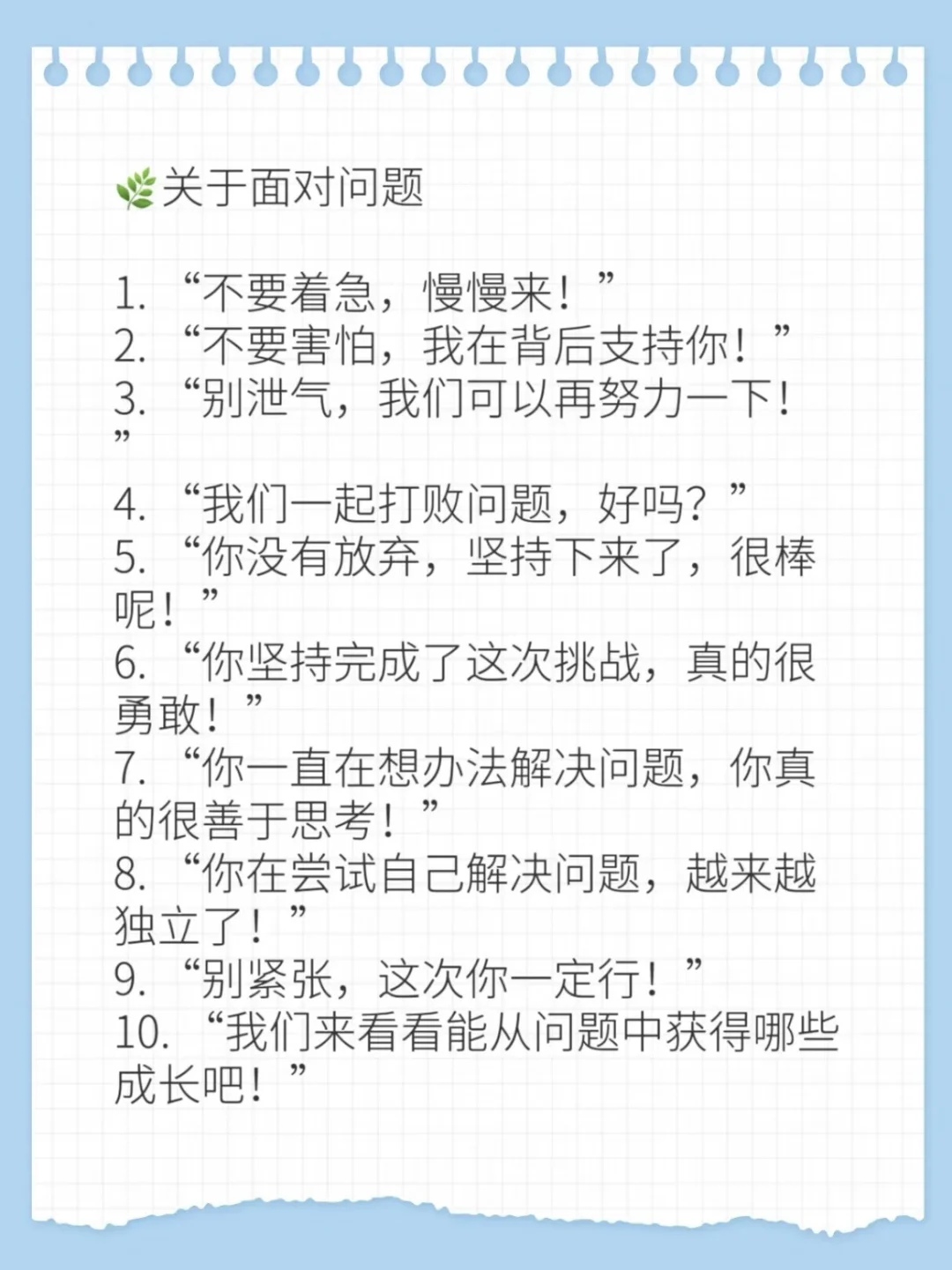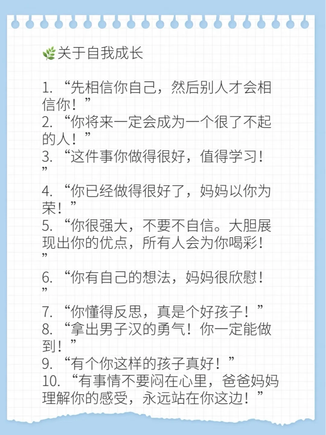 父母的说话方式藏着孩子一生的性格, 温暖有力量的语音,是孩子的人生底色 想养出什么样的孩子,就多说什么样的话 · ✅鼓励孩子表达情绪的话: 1.不开心可以哭,不用憋着 2.发泄情绪没关系,但不能伤害关心你的人 3.这件事没做好,你很难过吧,我能理解 4.你有点不高兴,需要我陪你吗 5.不开心可以扔枕头,可以在自己房间大喊 · ✅鼓励孩子自信的话: 1.虽然没有成功,但你学到了本领 2.虽然比赛输了,但努力过就值得 3.永远相信自己是个好孩子,哪怕被人否定 4.当你被人夸奖时,你能大方接受,并道谢 5.当你做错事时,你能勇敢承认,并改正 · ✅鼓励孩子上进的话: 1.你取得了进步,和你的努力分不开 2.你一定很用心,妈妈看到你进步很快 3.坚持下去,你会发现自己更强 4.你想要的自由,靠你不断自律获得 5.你的梦想不难,需要你努力去争取 · ✅培养孩子拒绝能力的话: 1.别人让你感到不舒服,可以表达出来 2.当你无法帮助别人时,及时告知对方 3.不想答应别人的请求,可以委婉地拒绝 4.当你不想分享玩具时,可以礼貌地拒绝 5.可以拒绝父母和老师,但前提要尊重他们 · ✅教孩子正确交友的话: 1.怂恿你做危险事的朋友,不能交 2.总是贬低嘲笑你的朋友,不能交 3.总是威胁打击你的朋友,不能交 4.常常嫉妒你的朋友,不能交 5.情绪常常失控的朋友,不能交 · ✅鼓励孩子独立的话: 1.自己洗的草莓更甜 2.遇到事情先自己尝试,实在不会再来找我 3.箱子打不开,你有别的办法吗 4.每天整理好书桌,你很有条理 5.这个有趣的提问,你是怎么想到的 · ✅培养孩子底线教育的话: 1.平安成长比成功更重要 2.当生命受到威胁时,可以忽略一切规则 3.不要为任何事伤害自己的身体 4.如果一段关系让你感到不堪,勇敢放手 5.学习是你自己的事,不要推给父母 · ✅培养孩子规则的话: 1.用过的东西请放回原位,这是习惯 2.不要在公众场合大吵大闹,这是素质 3.不要打断别人说话,这是尊重 4.别人的东西不要拿,这是教养 5.吃饭时不要用筷子搅来搅去,这是礼仪 · ✅培养孩子有主见的话: 1.妈妈想听听你的想法 2.虽然不是每次尝试都成功,但会离成功越来越近 3.虚心思考老师和同学对你的评价,但不必盲从 4.如果你不喜欢一件事,在别人下次做之前说出来 5.当你需要迎合哪位朋友时,试着找机会离开