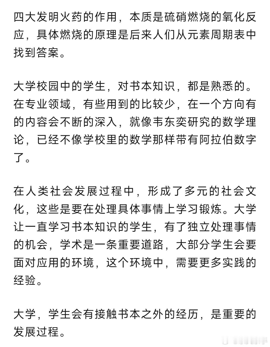 大学校园中的学生,对书本知识,都是熟悉的。在专业领域,有些用到的比较少,在一个方向有的内容会不断的深入,就像韦东奕研究的数学理论,已经不像学校里的数学那样带有阿拉伯数字了。
