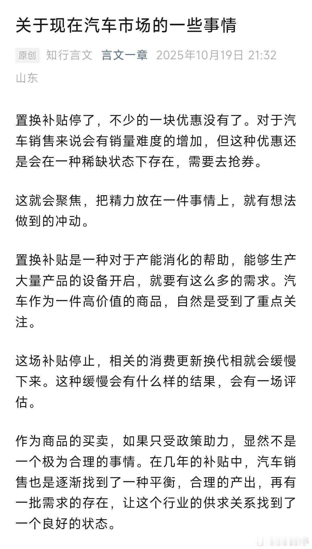 作为商品的买卖,如果只受政策助力,显然不是一个极为合理的事情。在几年的补贴中,汽车销售也是逐渐找到了一种平衡,合理的产出,再有一批需求的存在,让这个行业的供求关系找到了一个良好的状态。