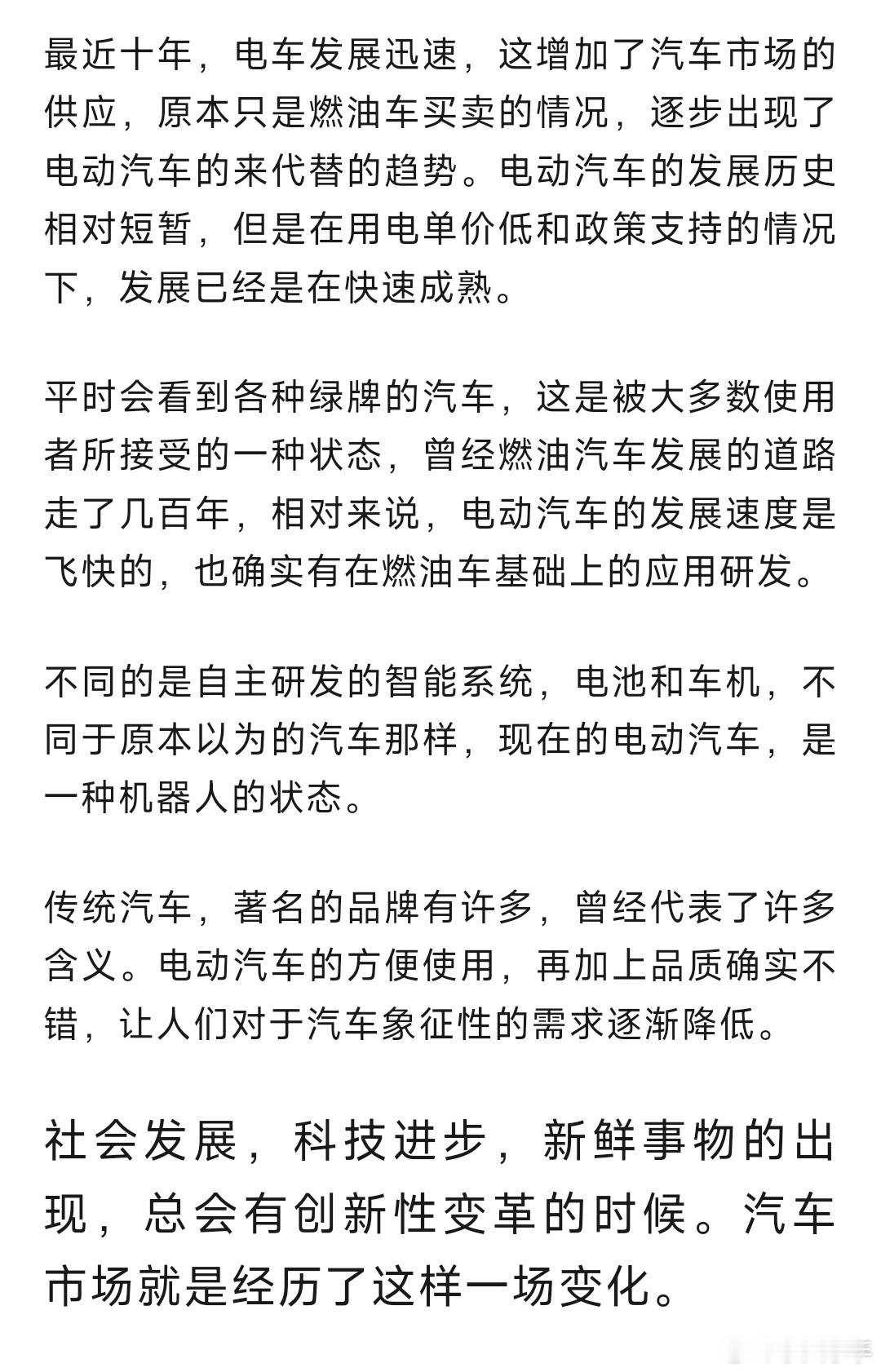 传统汽车,著名的品牌有许多,曾经代表了许多含义。电动汽车的方便使用,再加上品质确实不错,让人们对于汽车象征性的需求逐渐降低。