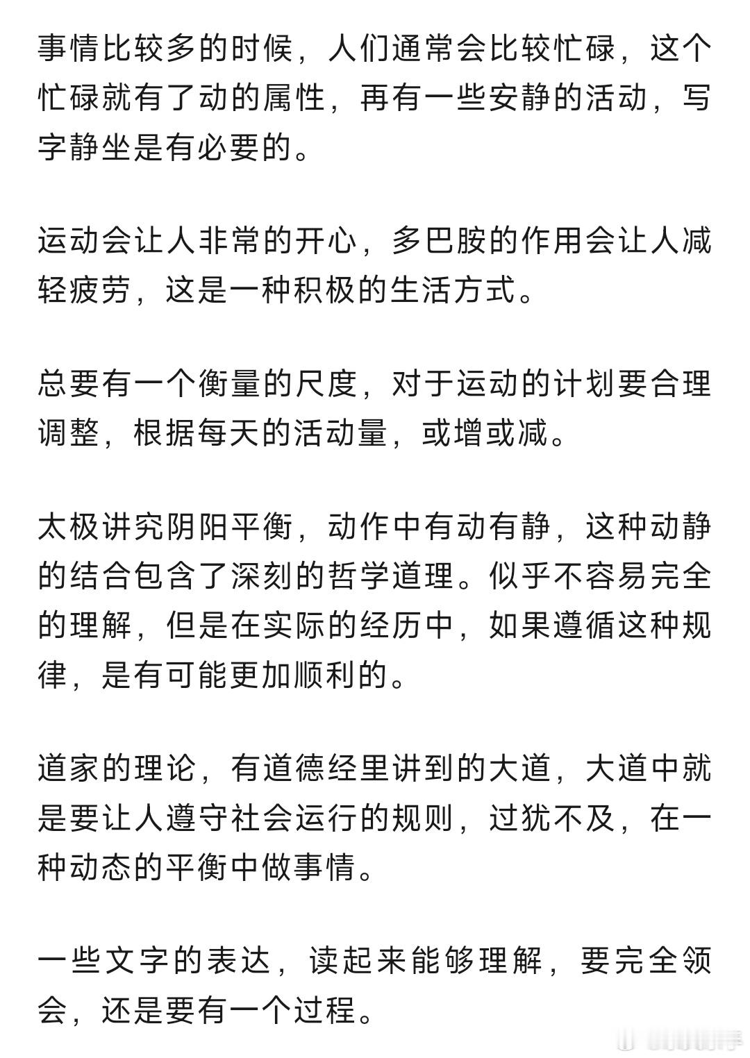 事情比较多的时候,人们通常会比较忙碌,这个忙碌就有了动的属性,再有一些安静的活动,写字静坐是有必要的。