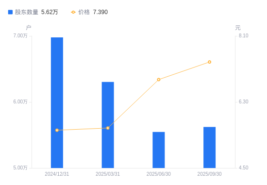 日期A股户数(户)流通A股户均持股数(股)户均持股市值(万元)2025-09-305620519394.2014.332025-06-305546219654.0113.582025-03-316302517295.539.672024-12-316977115623.278.642024-09-305783018849.2310.032024-06-305052521574.4913.312024-03-315381120257.0313.072023-12-316277617364.048.332023-09-306364317127.499.402023-06-307221815093.7811.35