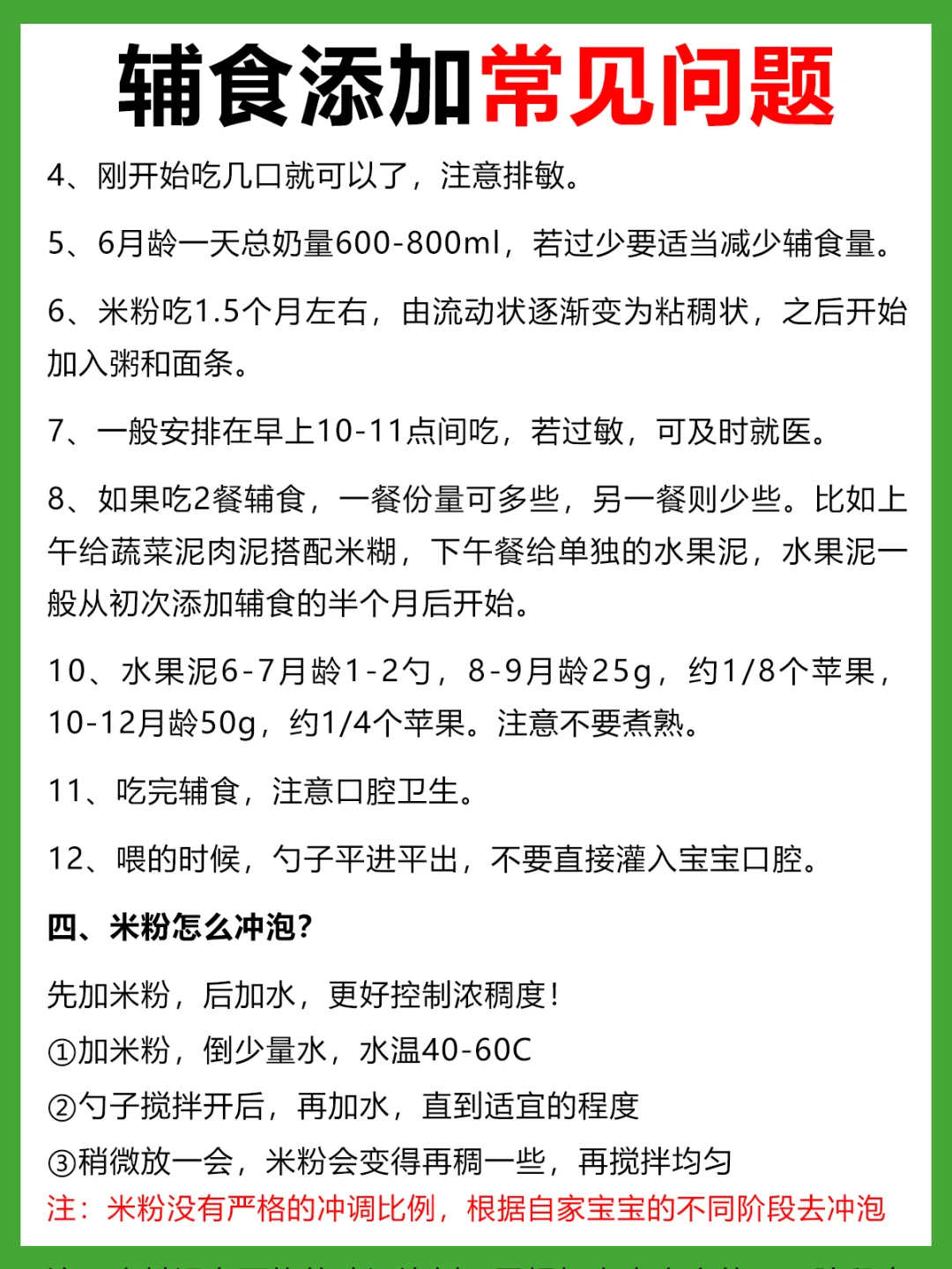 6月龄宝宝该要添加辅食了,如何给宝宝添加,怎么脱敏等都是有讲究的,想要宝宝胖胖呼呼,妈妈要学会怎么给宝宝添加辅食,常见辅食添加问题整理如上,各位妈妈可参考下