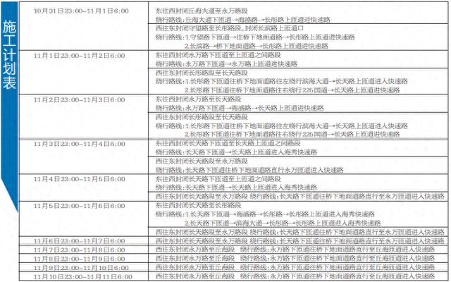 管制时间为10月31日至11月16日,每日23:00至次日6:00,具体管制路段详见施工计划表(如天气影响,施工时间顺延)。请车主提前关注交通提示标牌及导航信息,规划绕行路线,由此带来的不便敬请谅解。