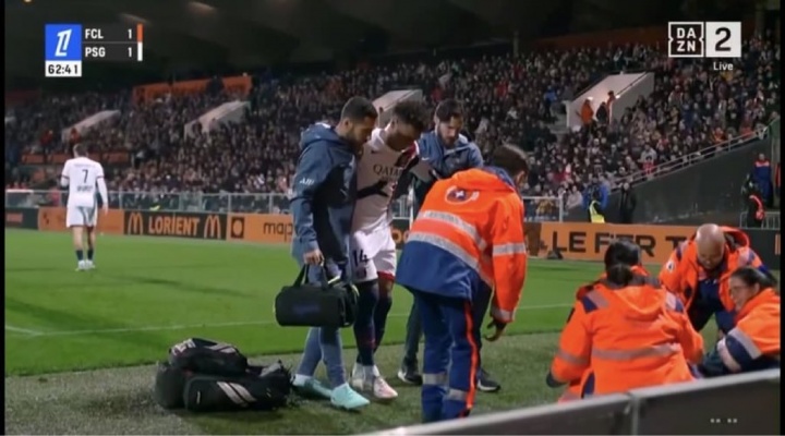 直播吧10月31日讯rmcsport报道,在周三的法甲联赛中,巴黎圣日耳曼与洛里昂战成1-1平局。比赛进行到第61分钟时,20岁的法国国脚德西雷-杜埃因右大腿受伤被担架抬出场外。尽管他在比赛中表现不佳,但这次伤病显然对他造成了很大的困扰。
